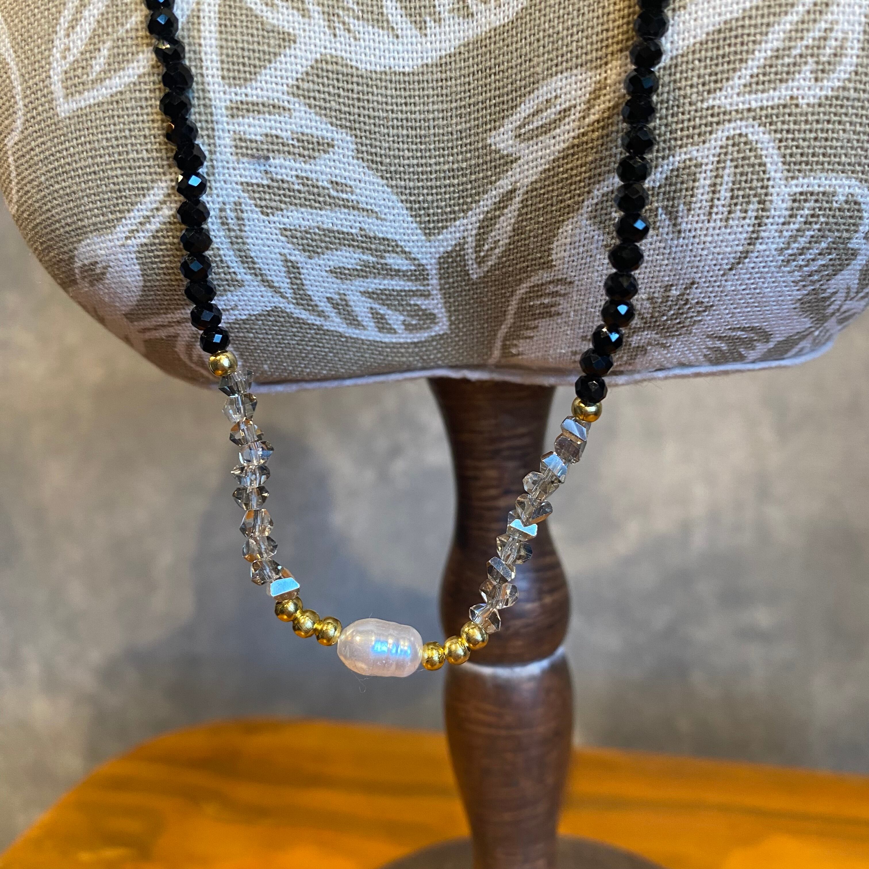 シックで魅力的なブラック×ガラス×パールのネックレス!深い黒色のブラックガラスと輝くガラスビーズ、パールが絶妙に組み合わさり、洗練された印象を与えます。特別な日のお祝いから、日常のカジュアルスタイルまで幅広く活躍するアイテムです。