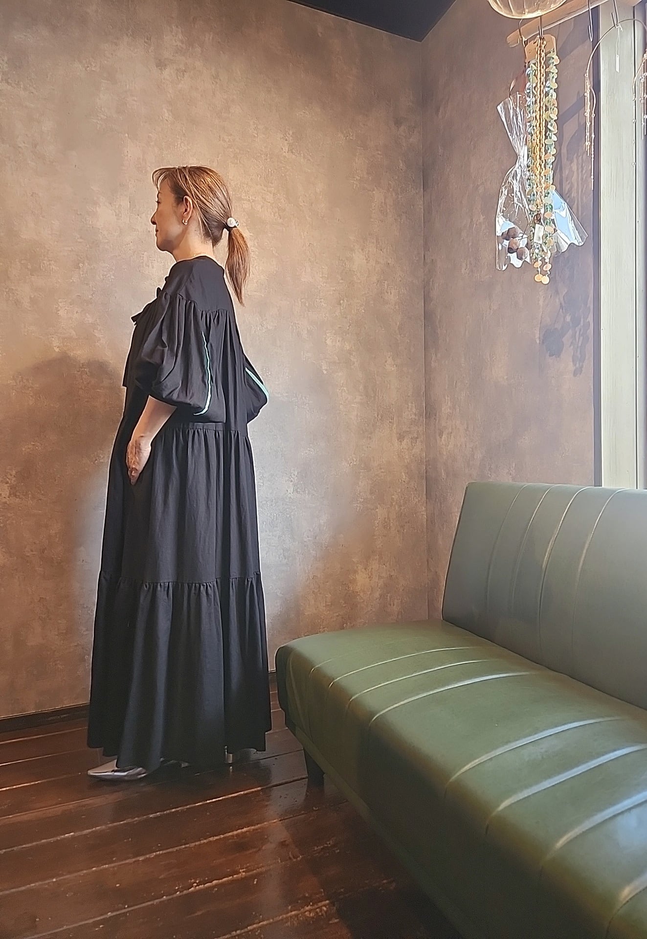 袖に施されたグリーンのラインが後ろ姿を個性的に見せてくれます