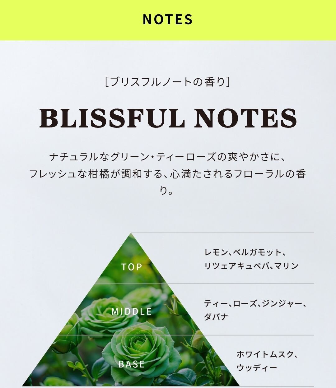 有名調香師が手がけた、華やかなローズをフレッシュな柑橘とグリーンノートをあわせた幸福感あふれる清楚なブリスフルノートの香り。