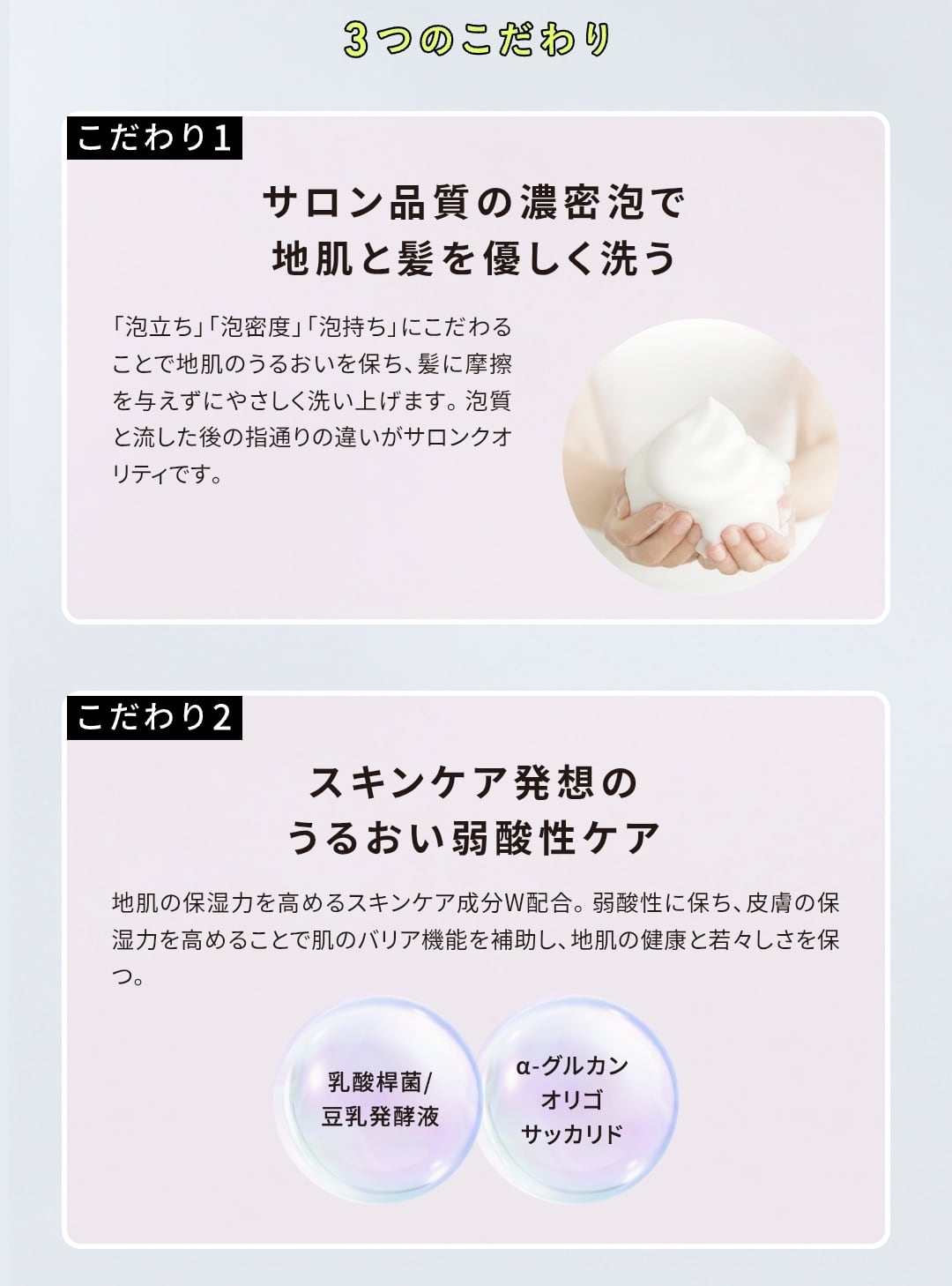 低刺激系洗浄剤にスキンケア発想の乳酸菌発酵エキスやα-グルカンオリゴサッカリドなどを配合した、頭皮や髪に優しいノンシリコンシャンプー。