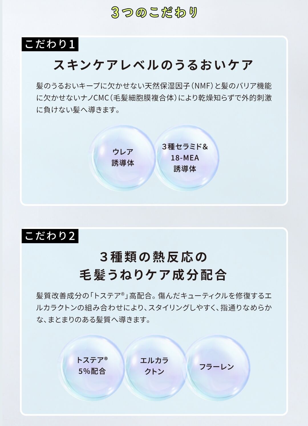 アイロンやドライヤーの熱と反応することで、カールやストレートの保持力を向上し、毛髪のねじれ・うねりを補正しながら髪を柔らかな手触りに仕上げます。