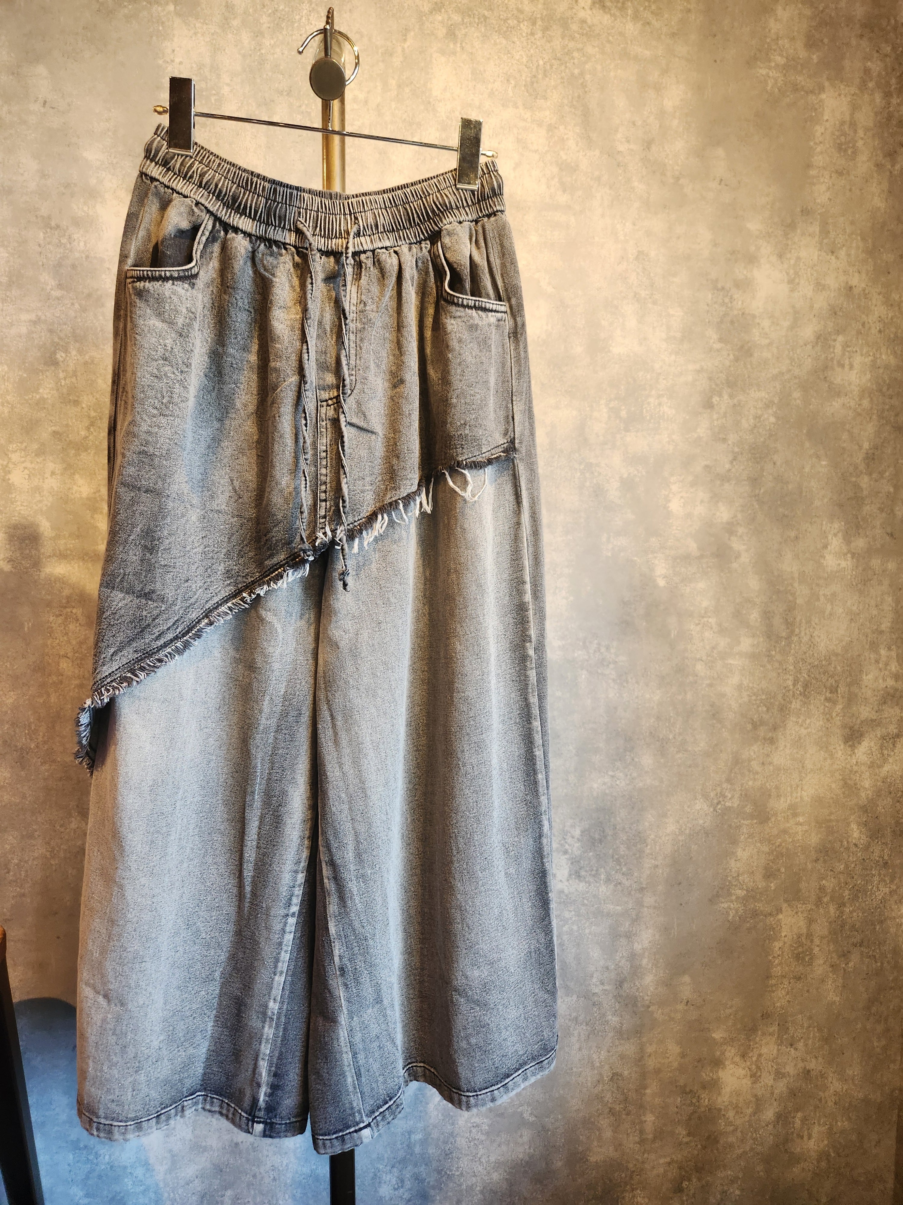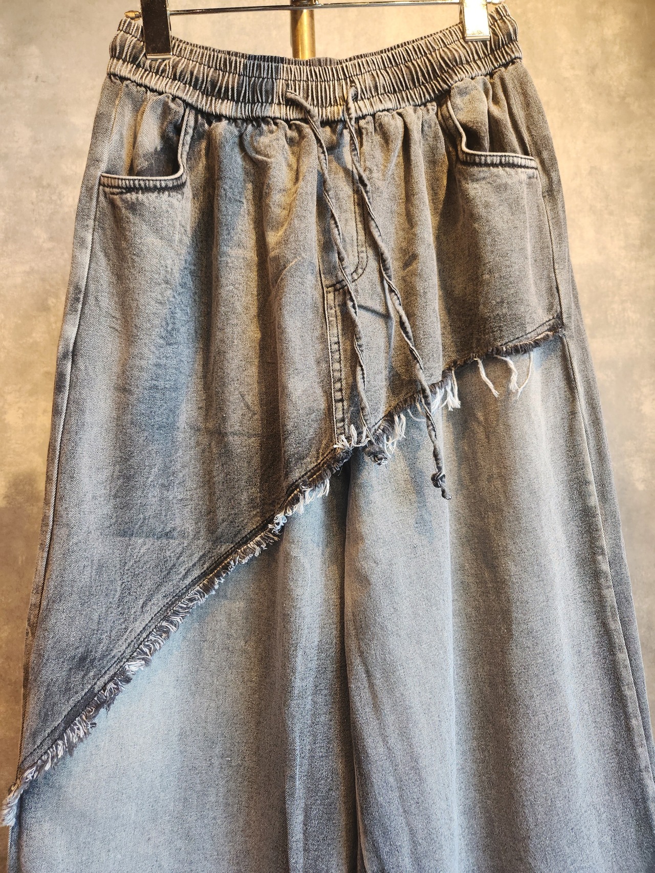 スカーフを腰に巻いたように見えるデザイン性の高いデニムパンツ