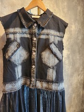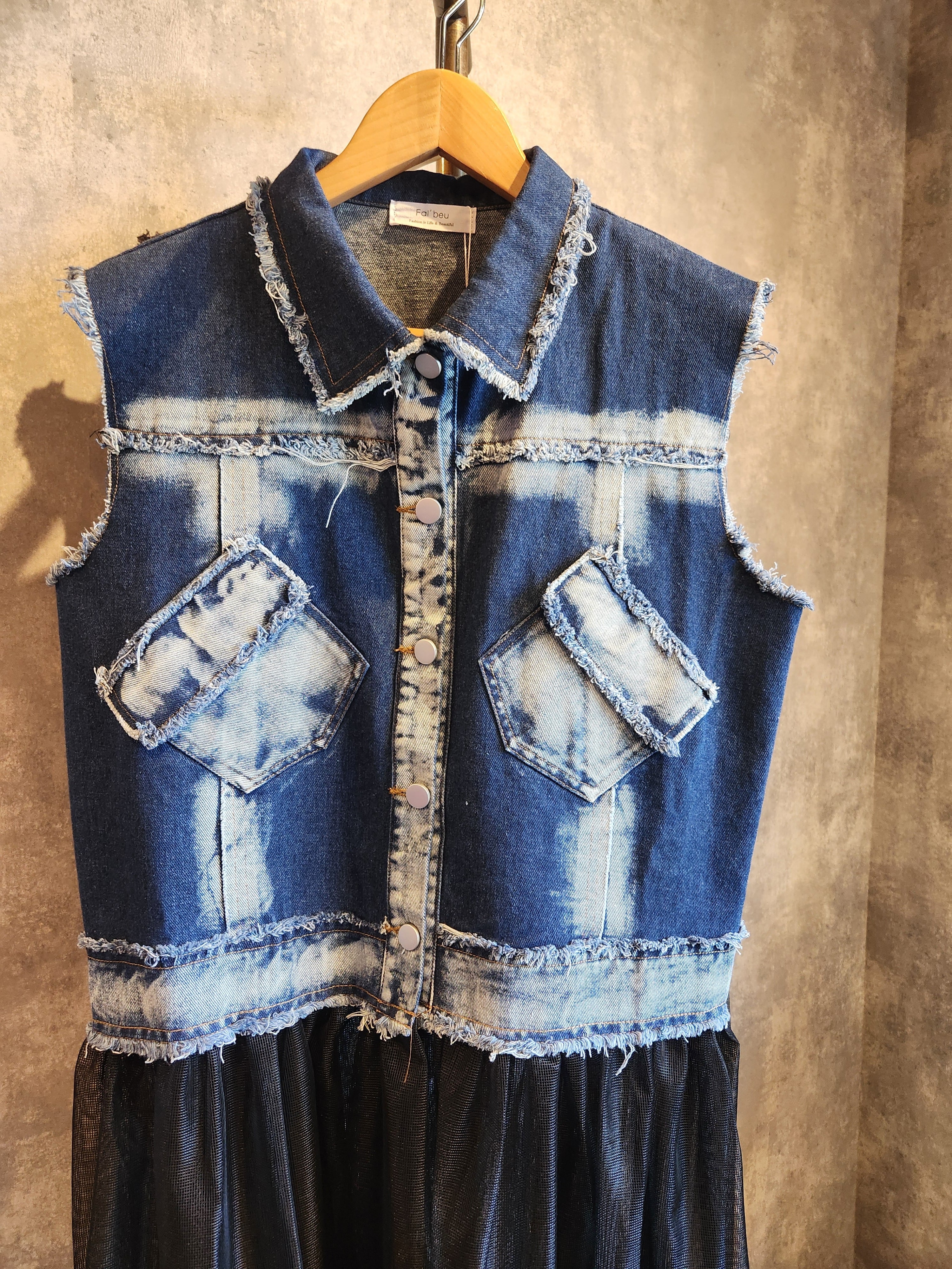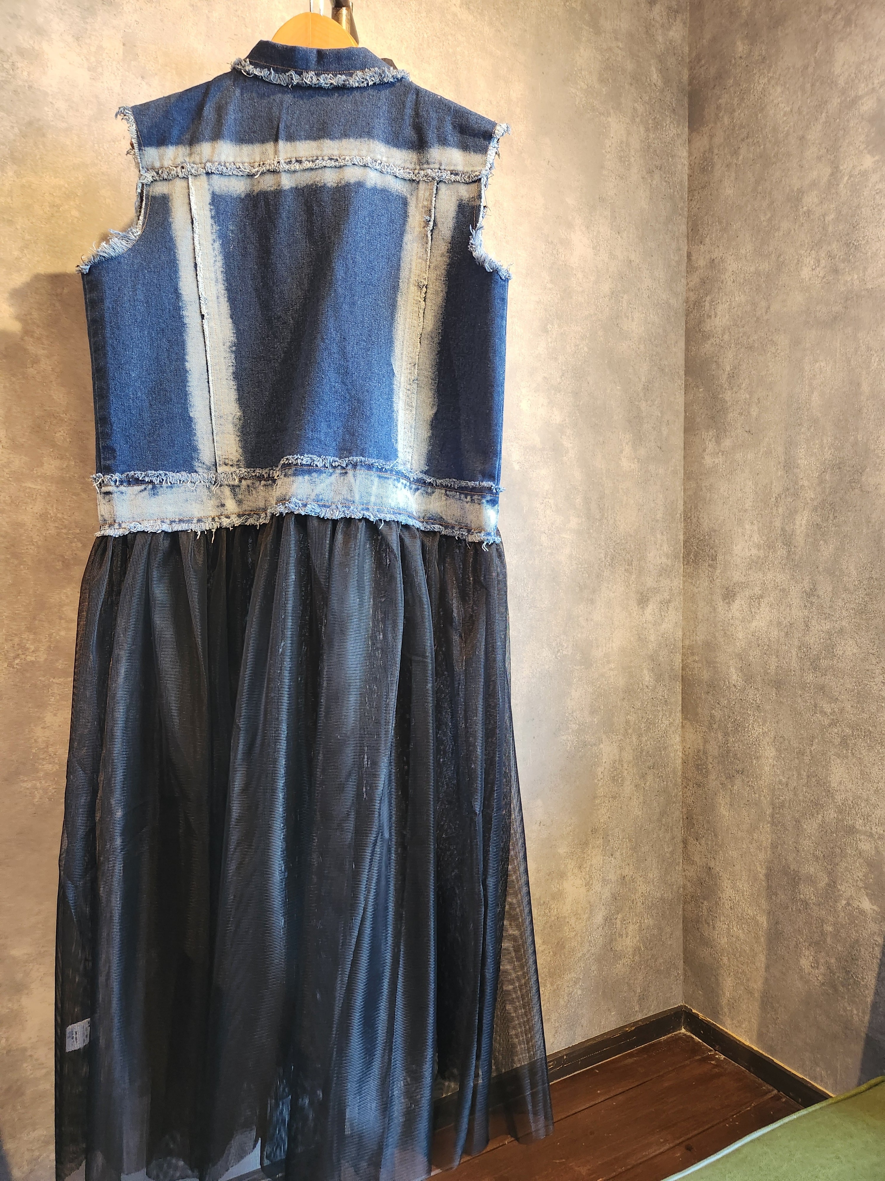 デニムとチュールをドッキングさせた、デザイン性の高いワンピース。