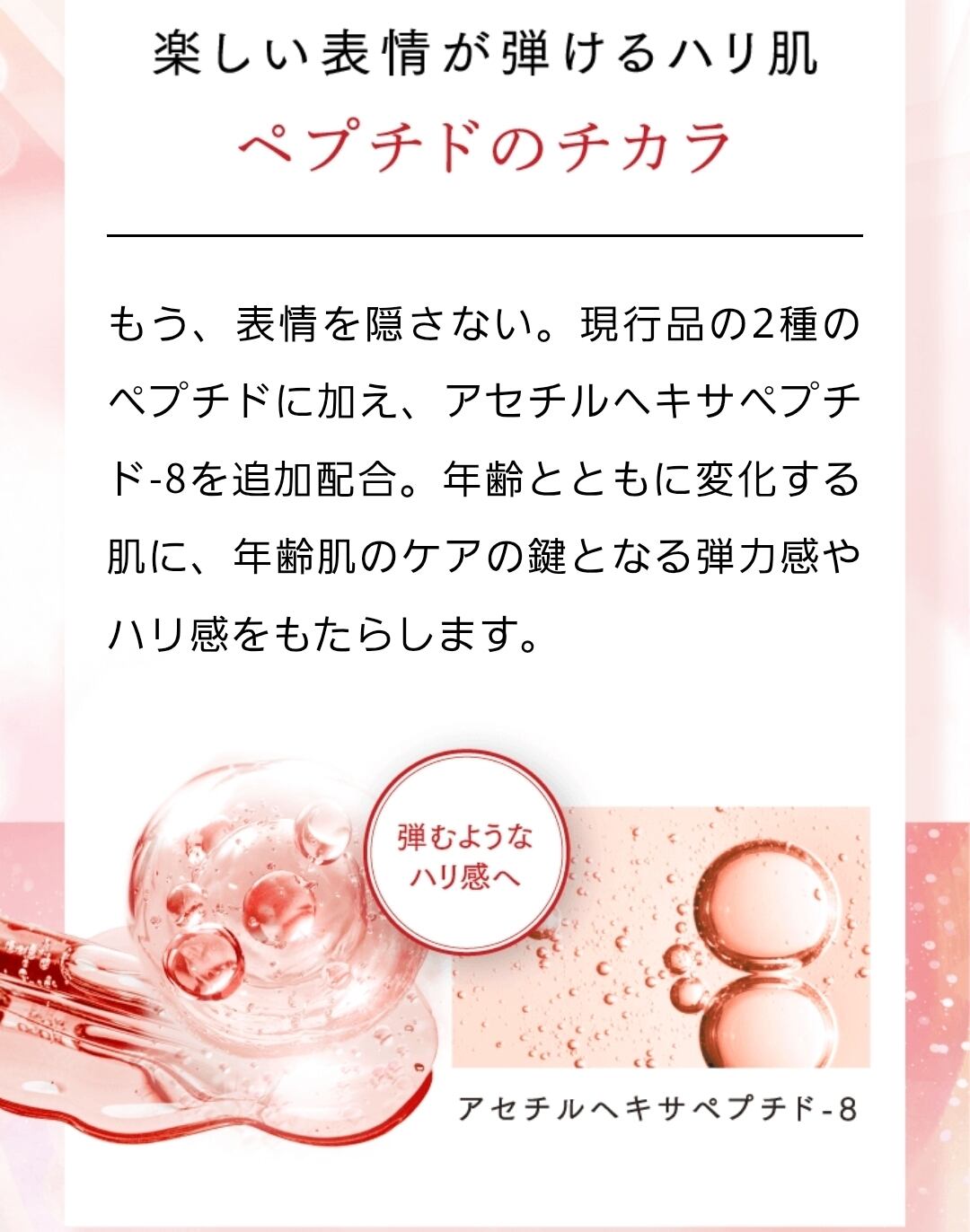 もう表情を隠さない。現行品の2種のペプチドに加え、アセチルヘキサペプチド-8を追加配合。年齢とともに変化する肌に、肌年齢のケアの鍵となる弾力感やハリ感をもたらします。