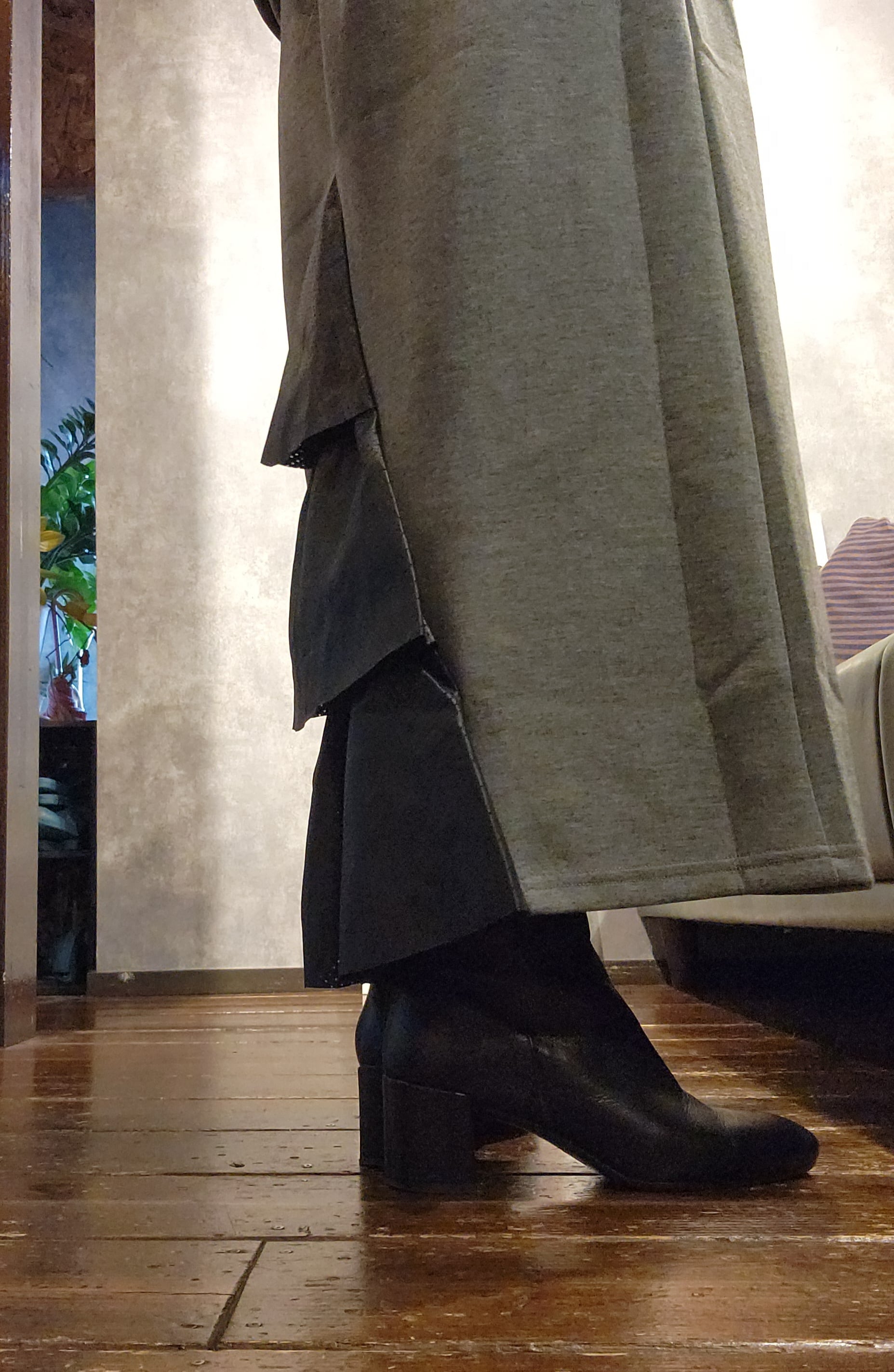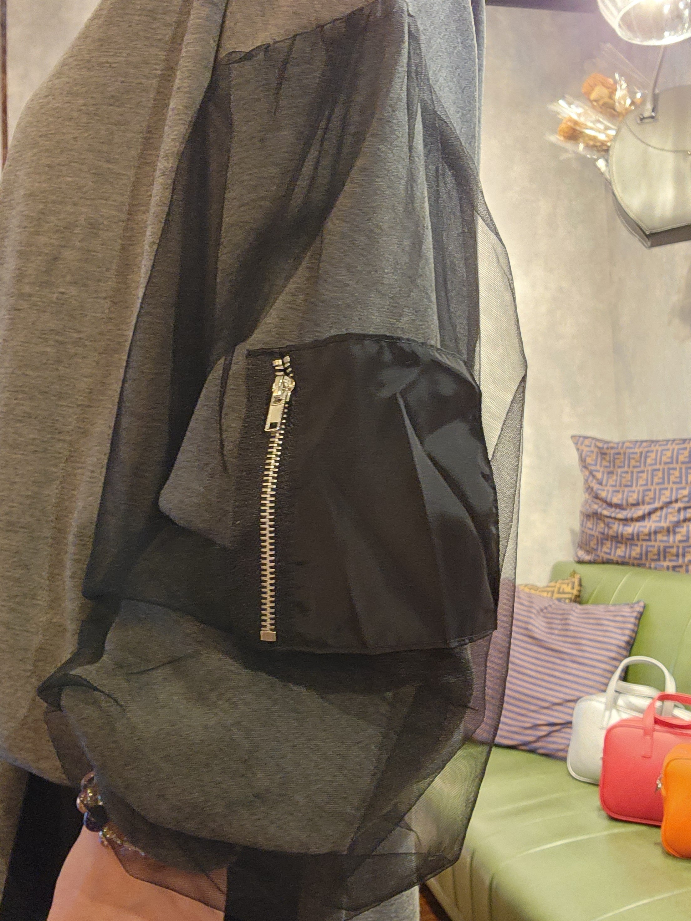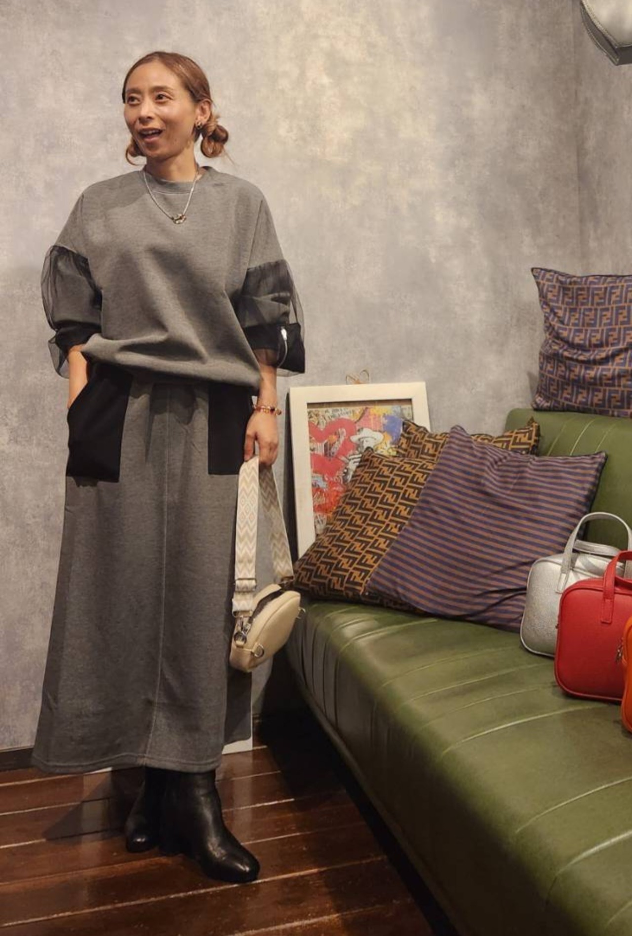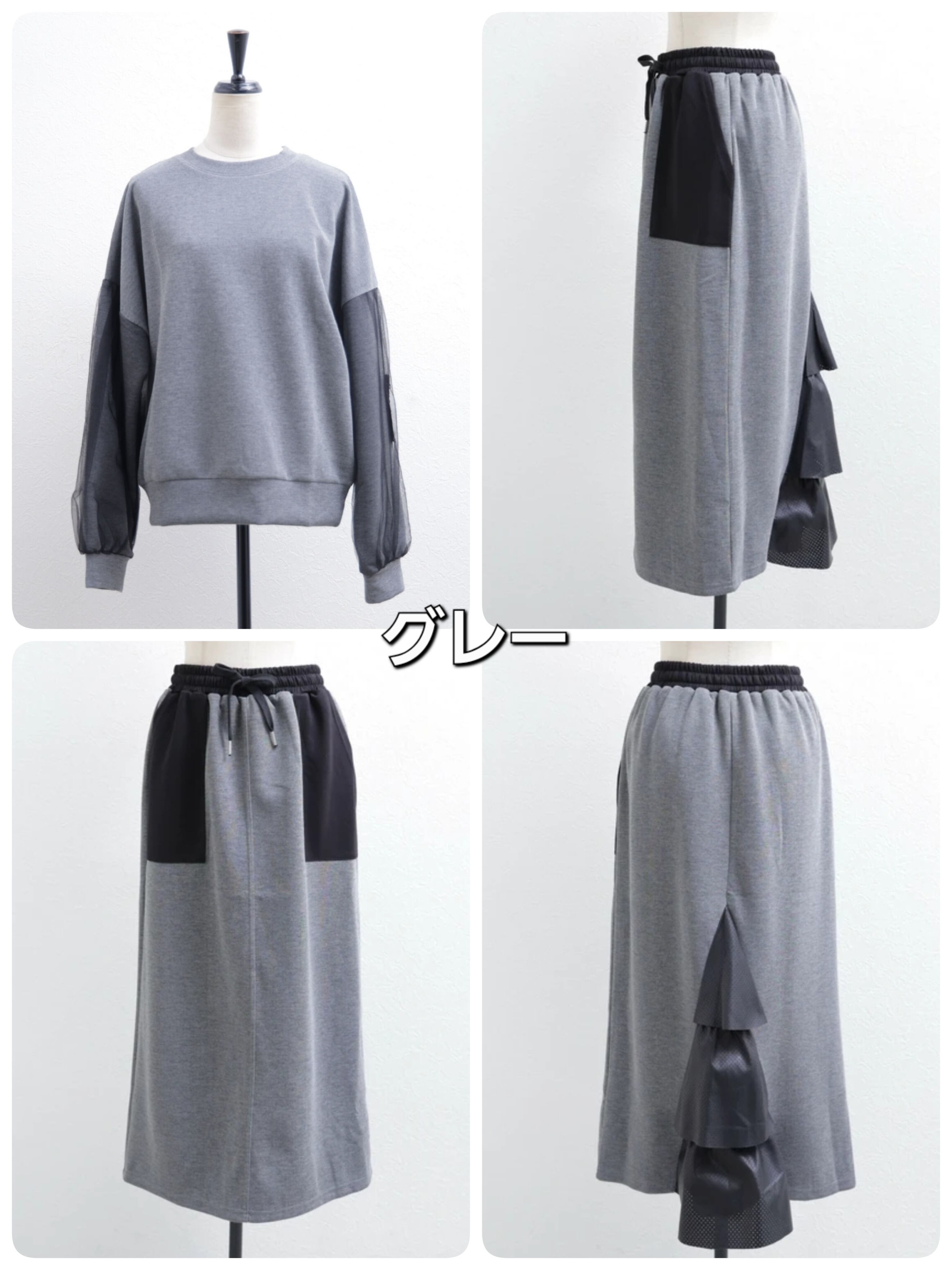 動きやすい薄手のスウェット地を使ったスカートポケットのバイカラーデザインが目を引きます。バックは部分的にフリルをあしらい