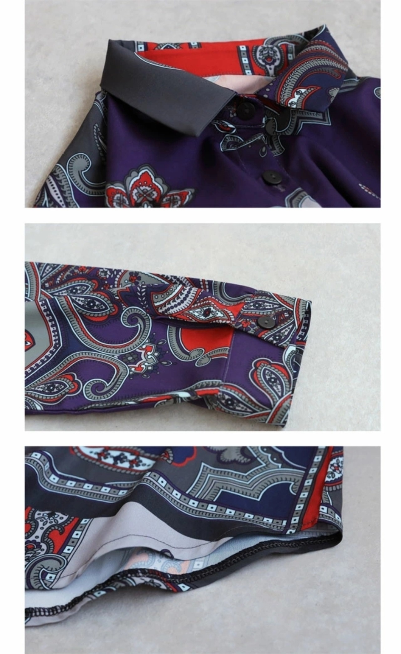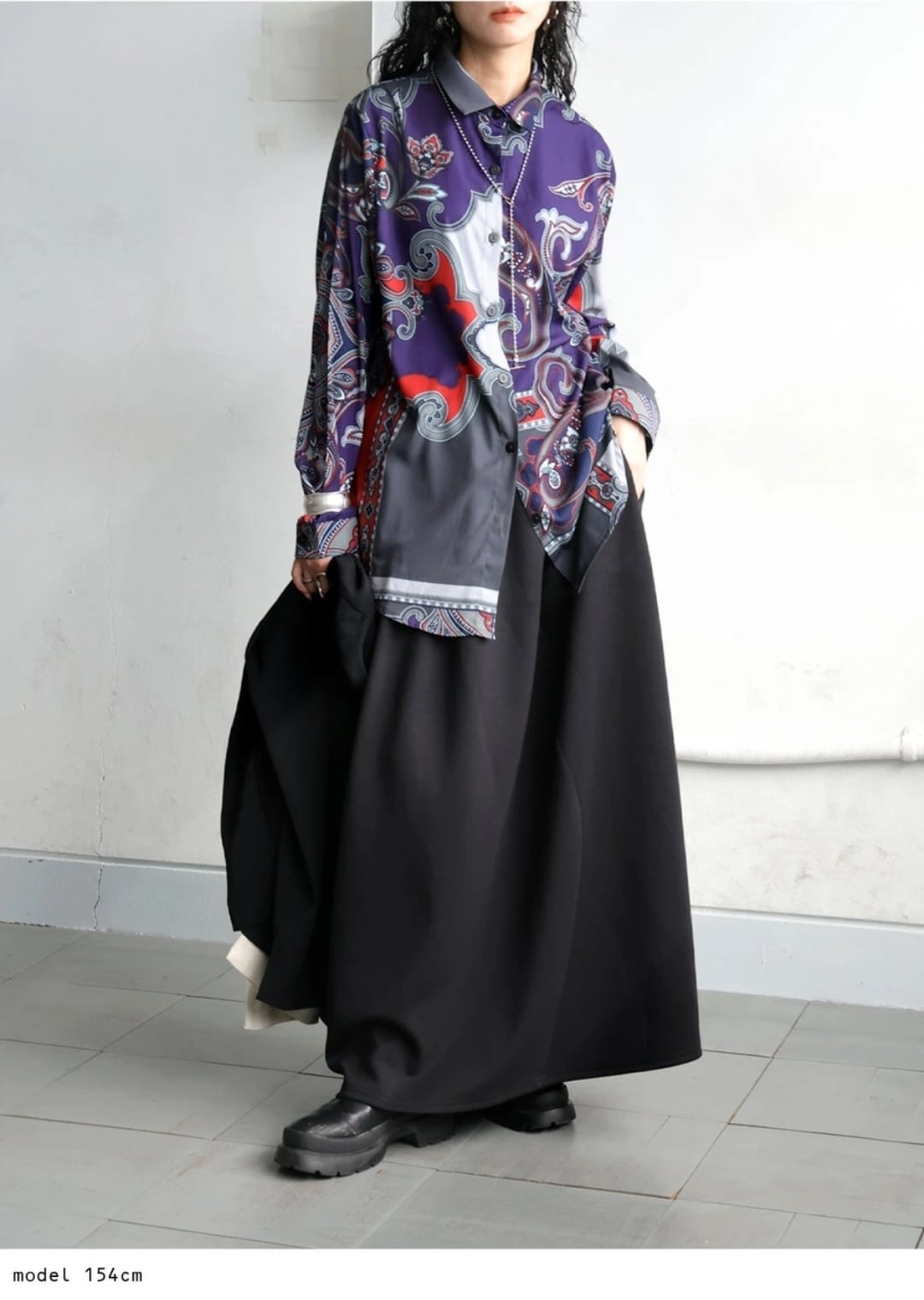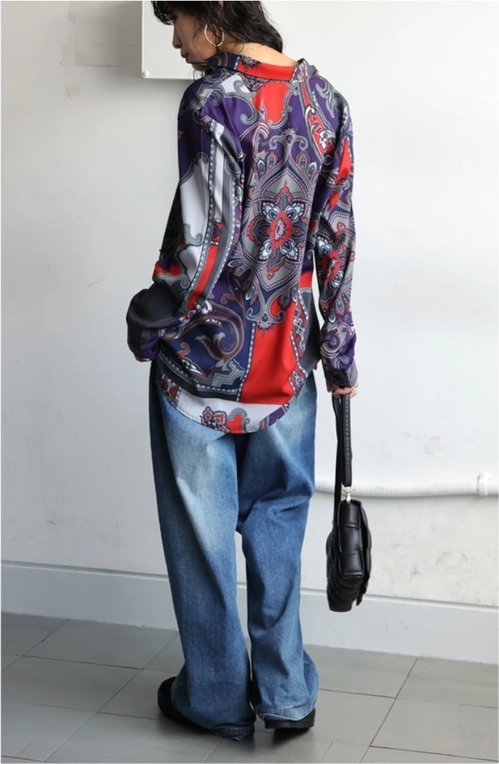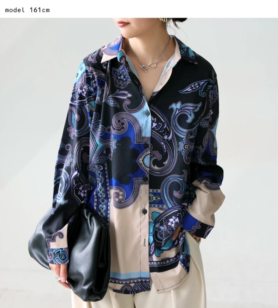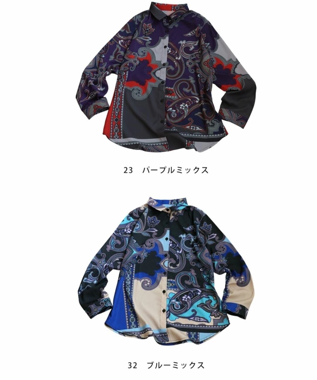 クラシカルなペイズリー柄と大胆な配色が目を引く、サテン風の長袖シャツです。