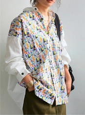 視線を奪う、フロント全面に施されたカラフルなアート柄が主役のデザインシャツ。