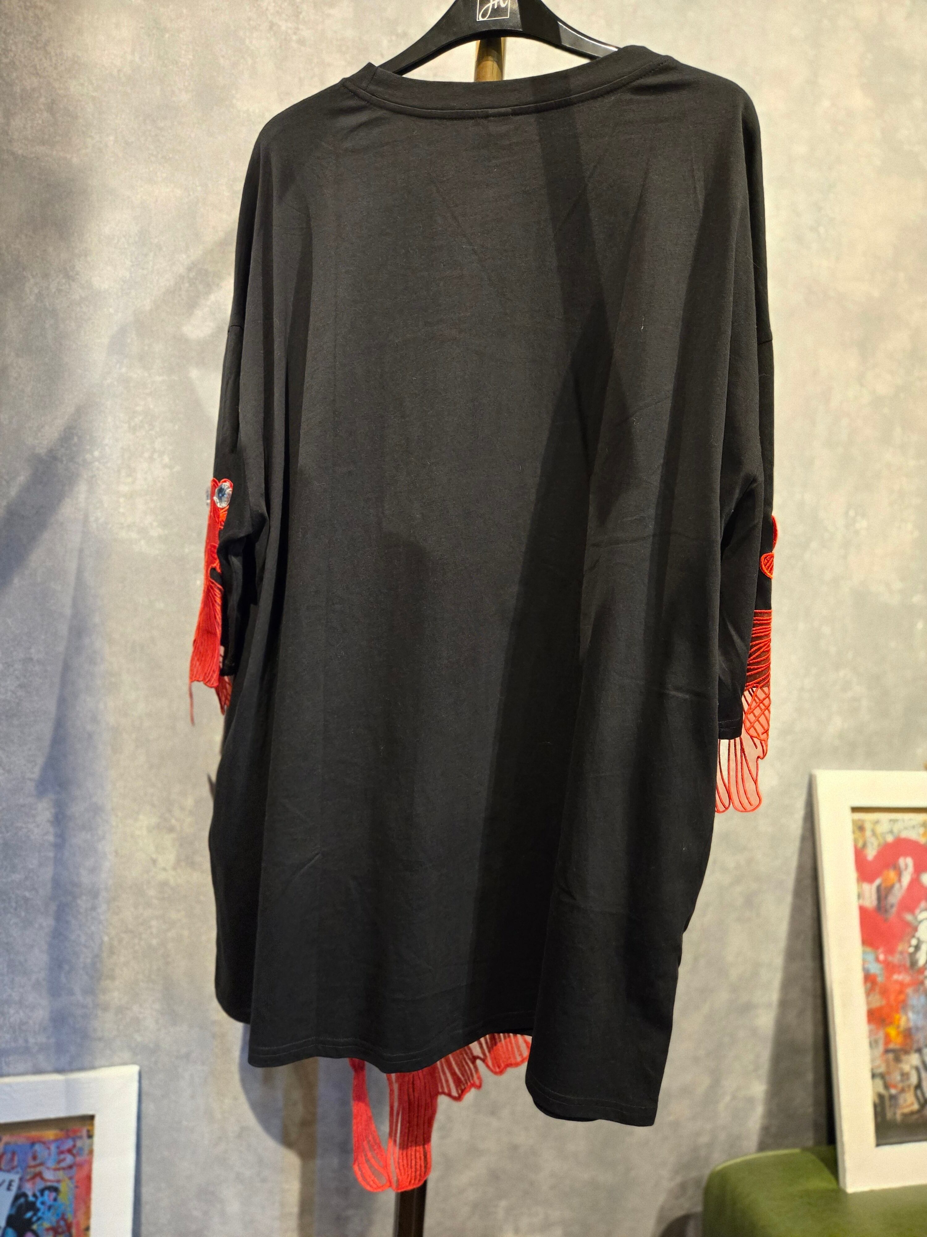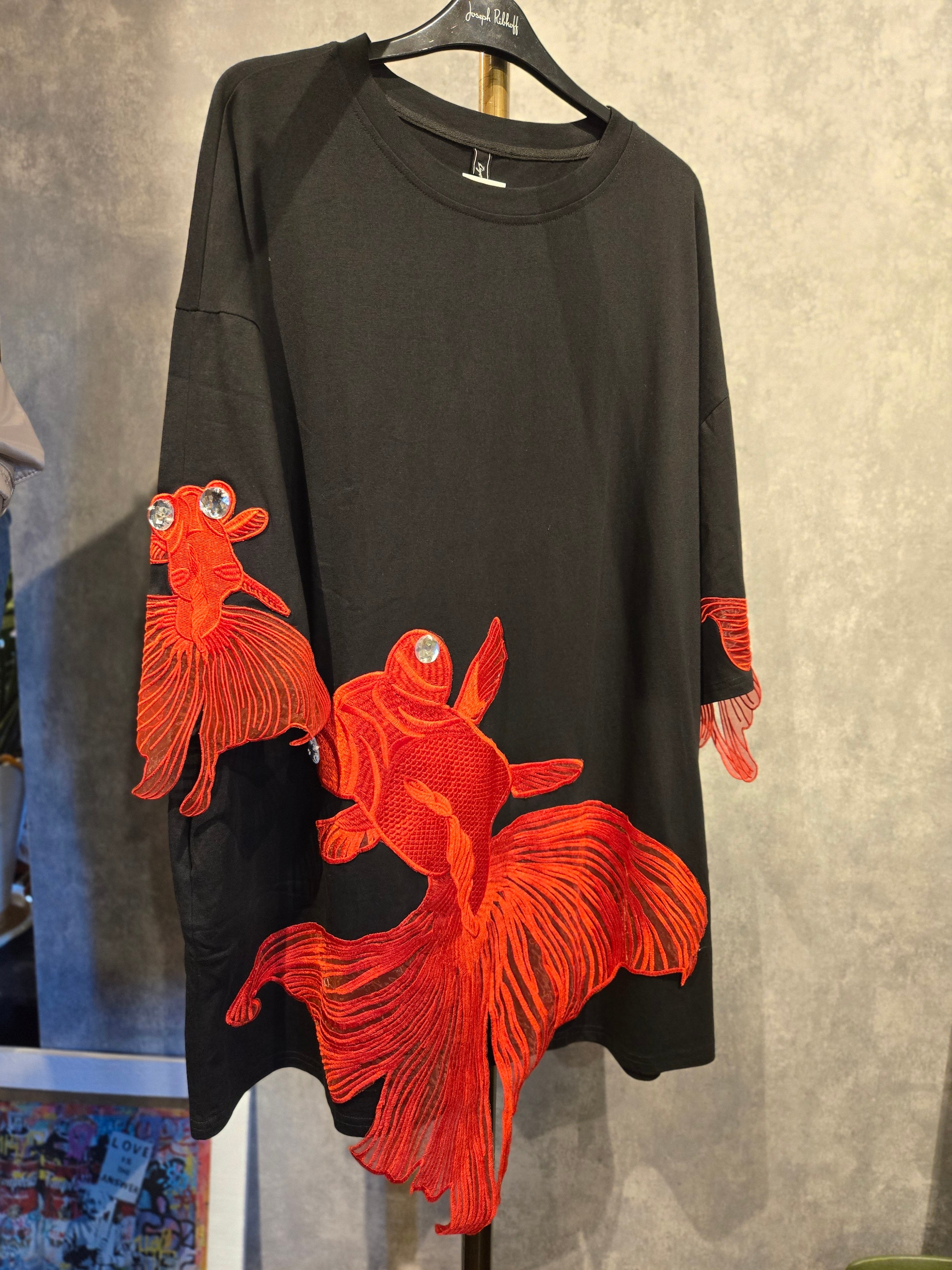赤い金魚のモチーフが印象的な、BIGチュニック丈Tシャツです。