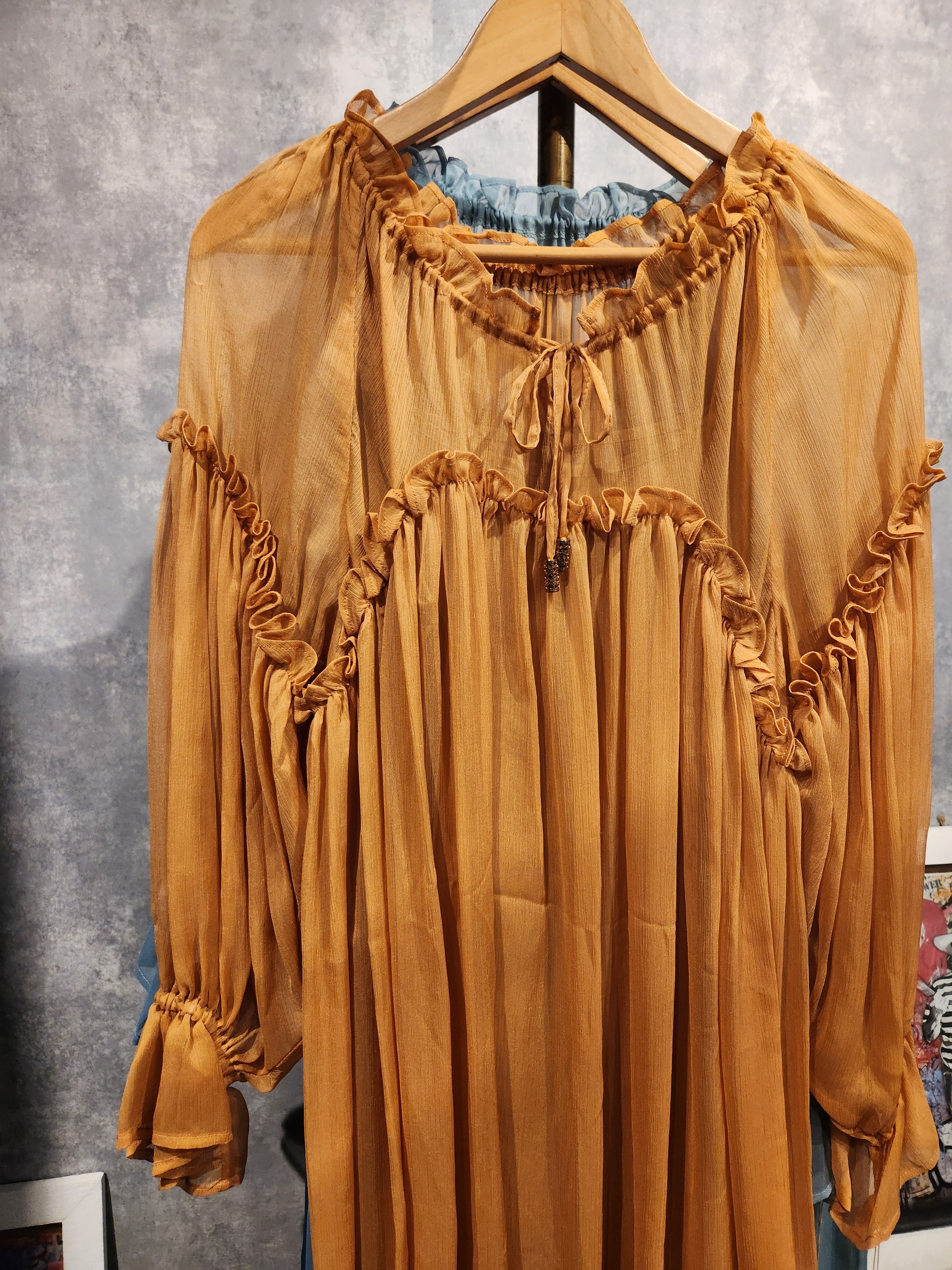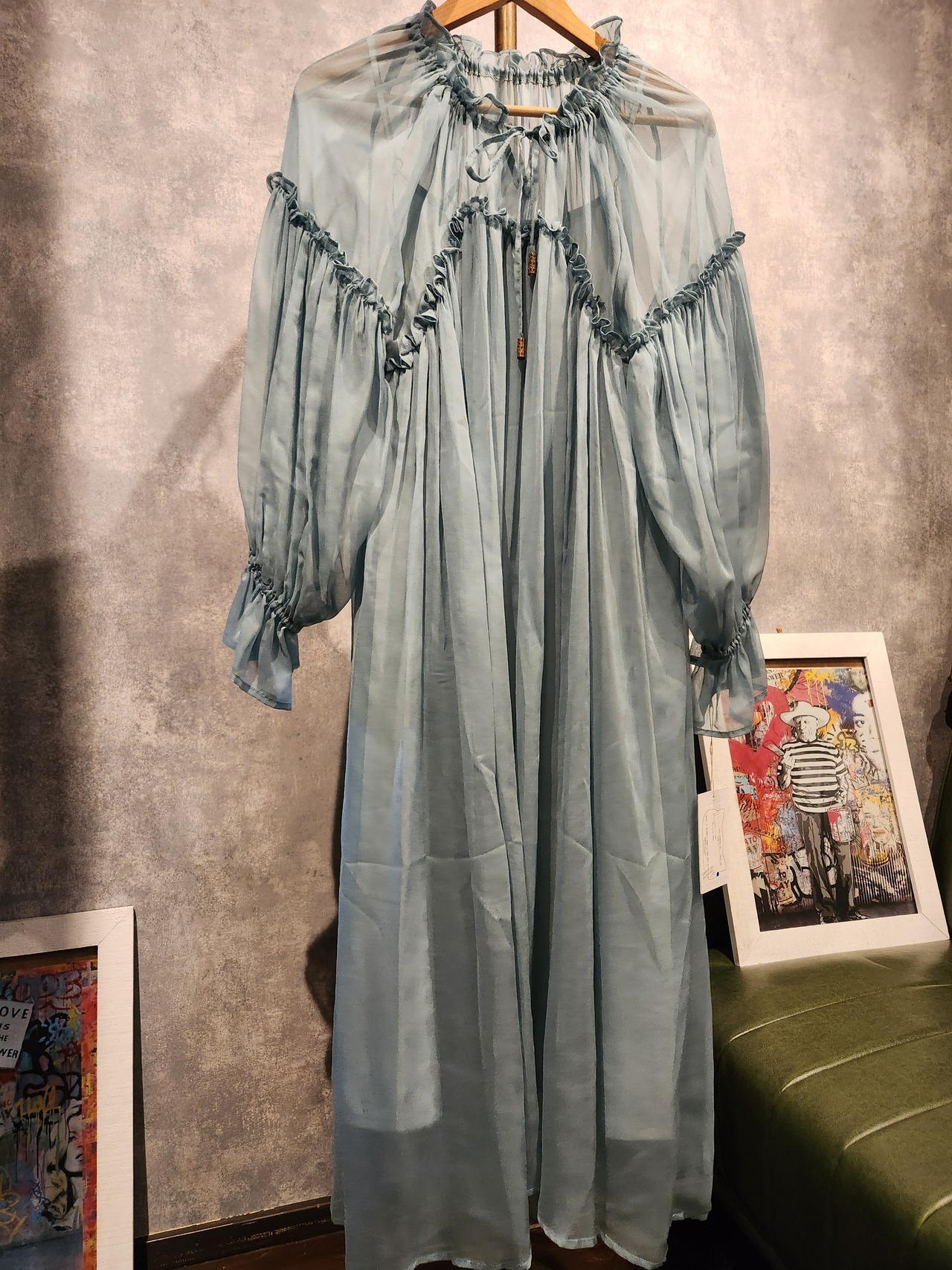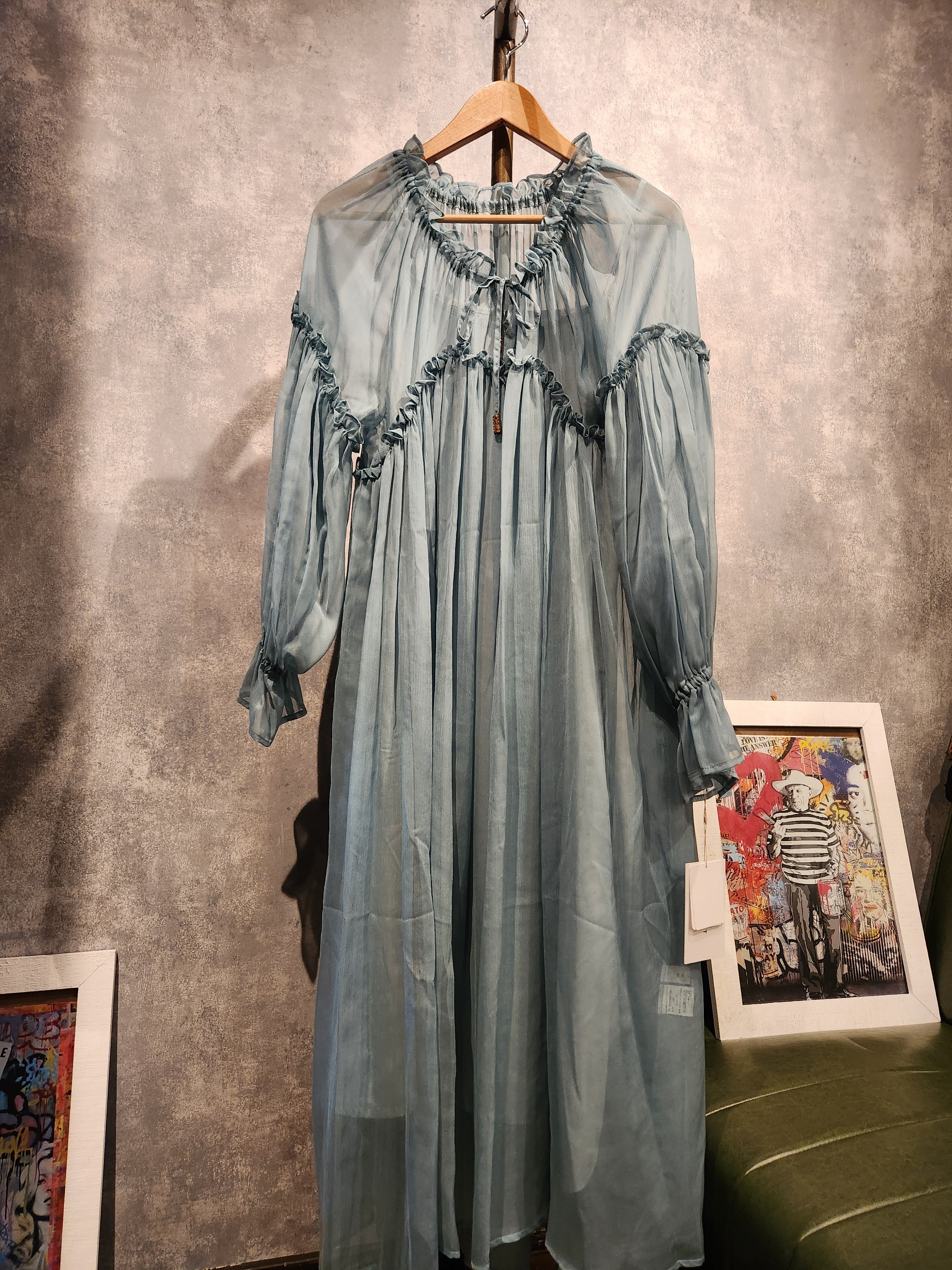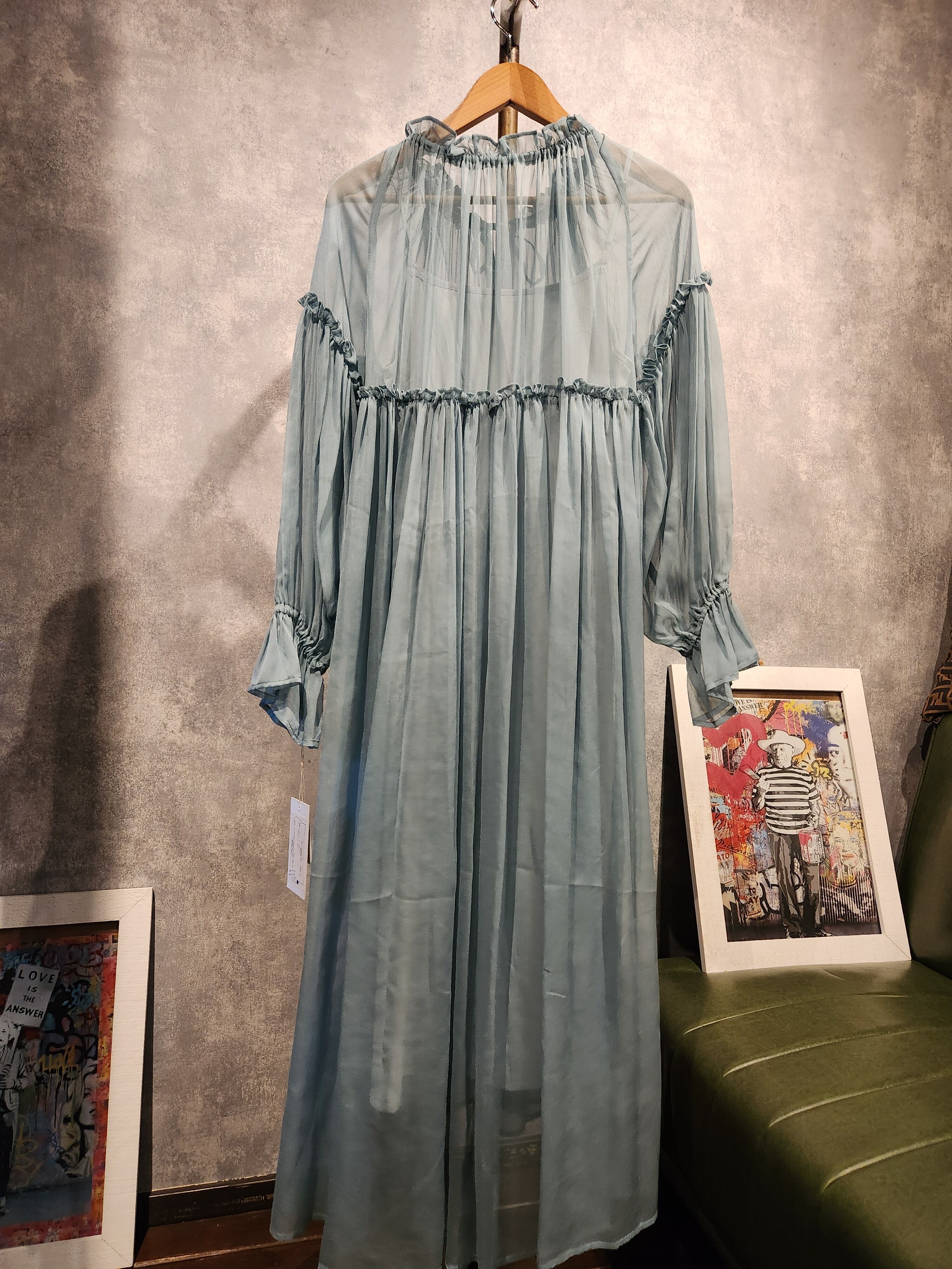 シフォン素材のフリルワンピース、柔らかな雰囲気を作り出してくれます