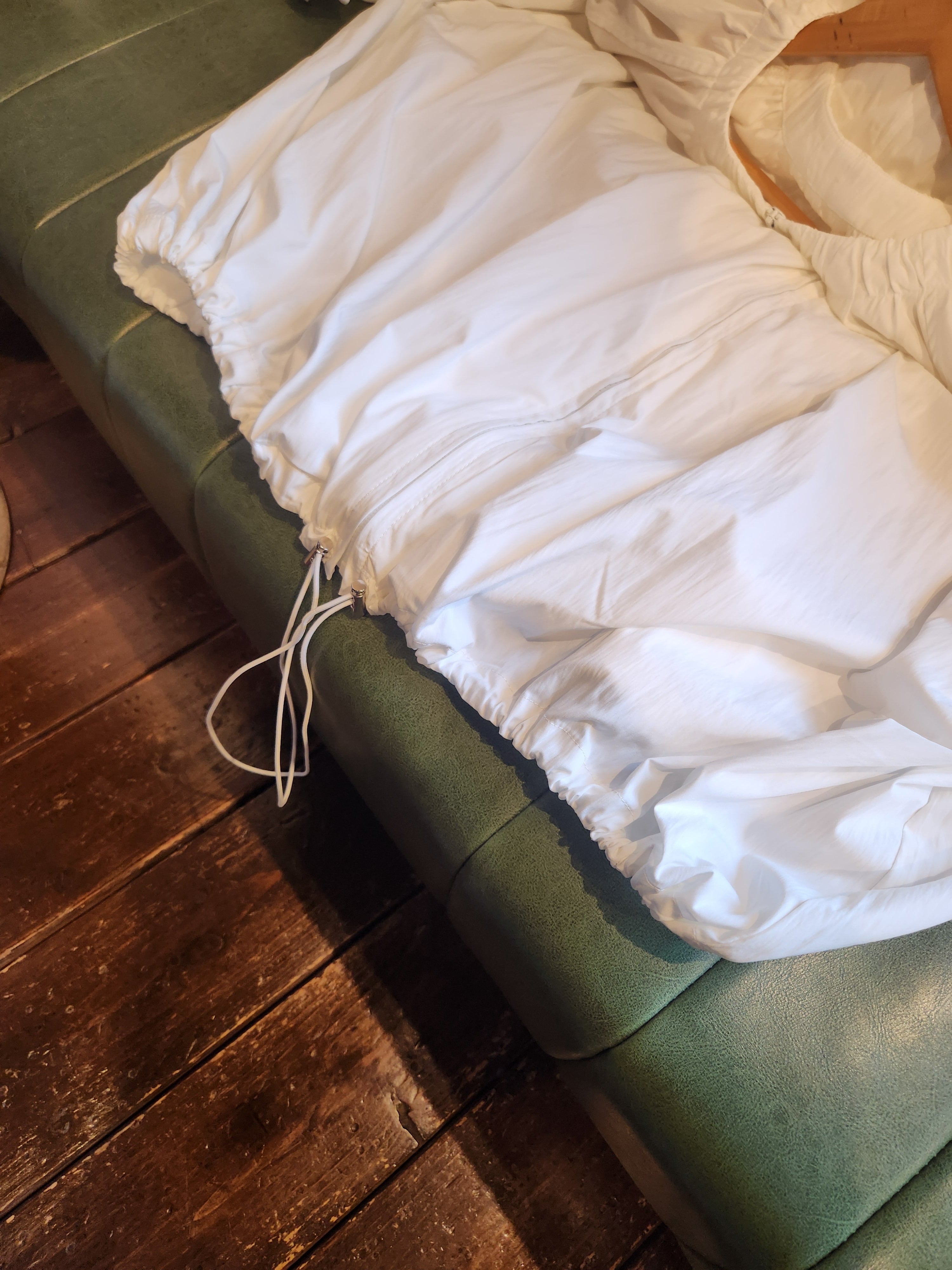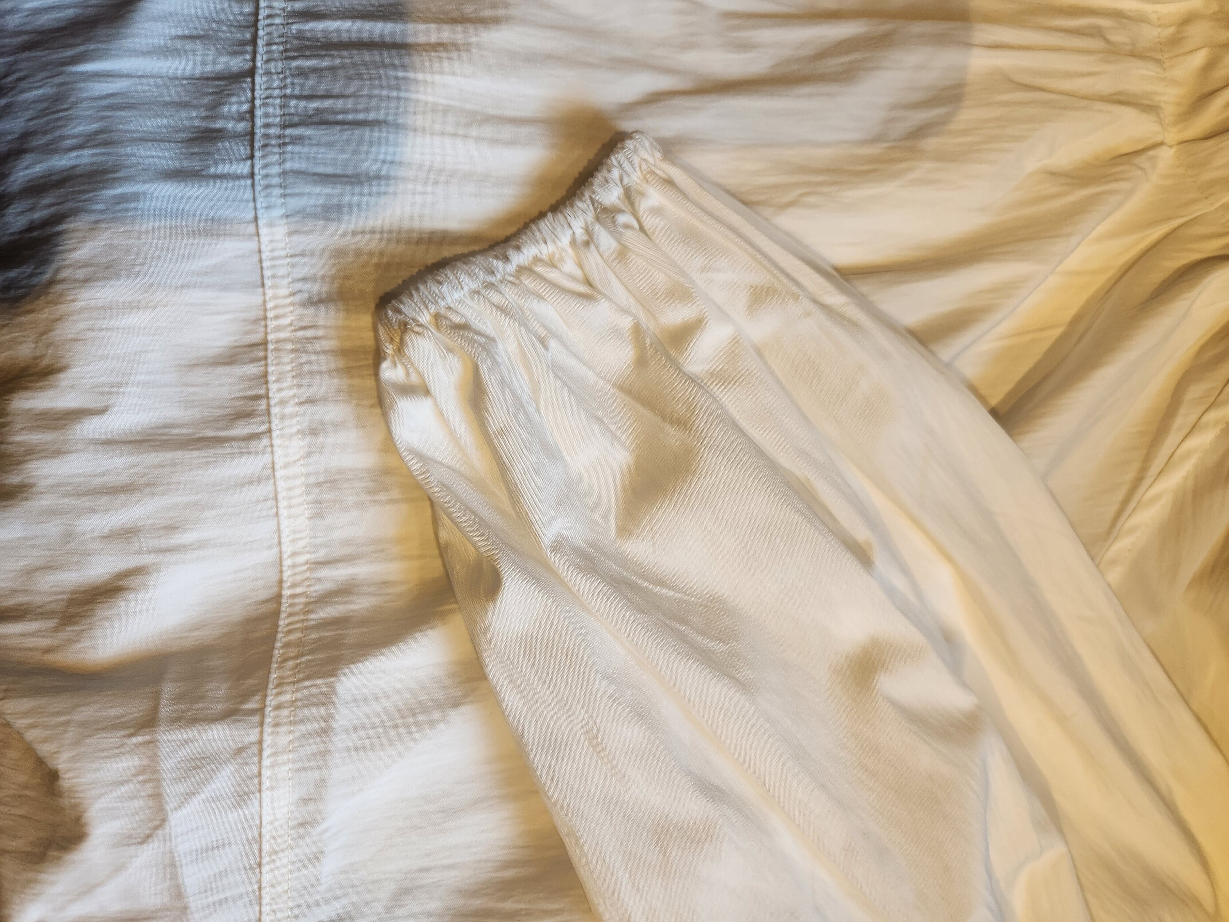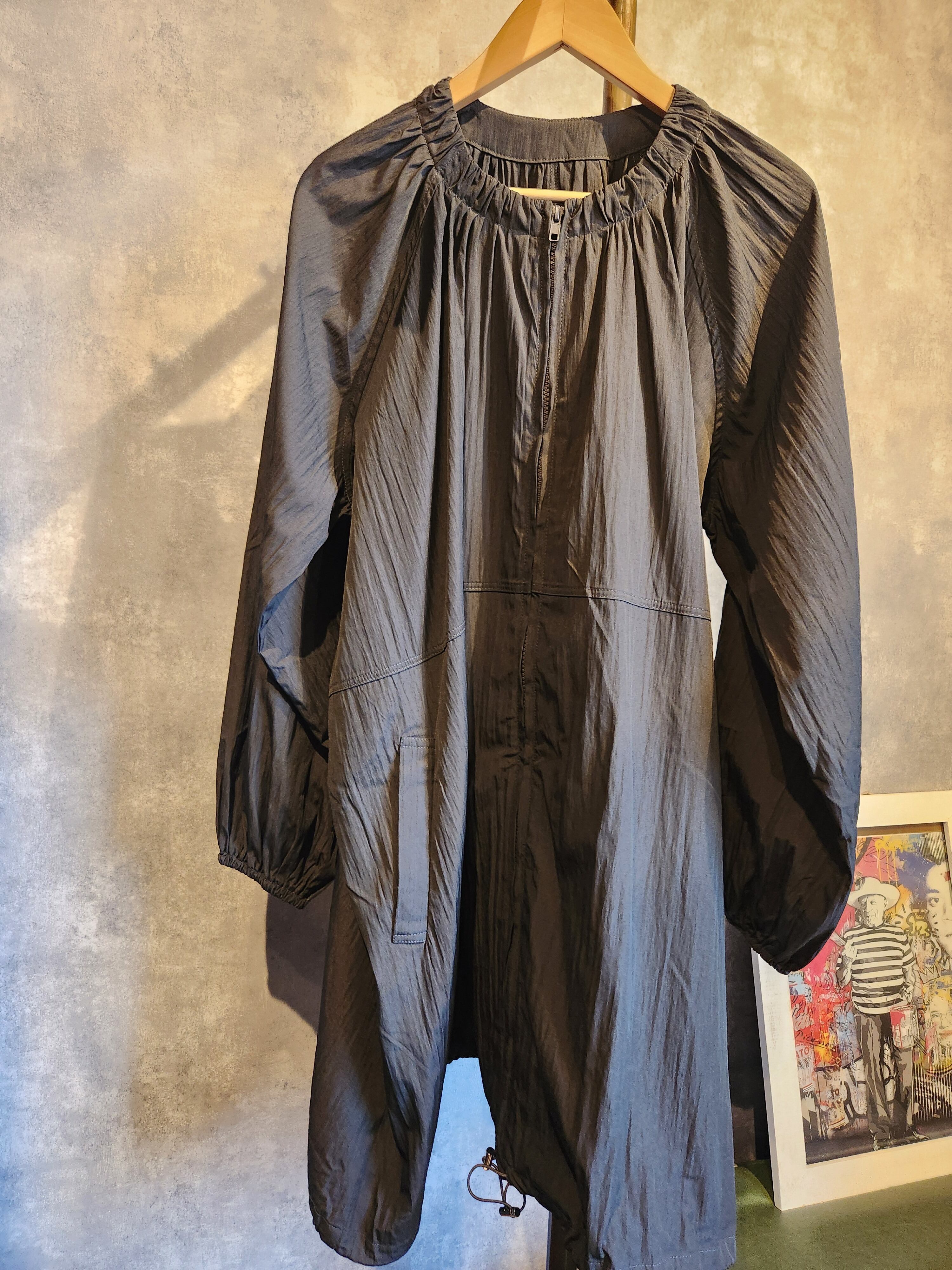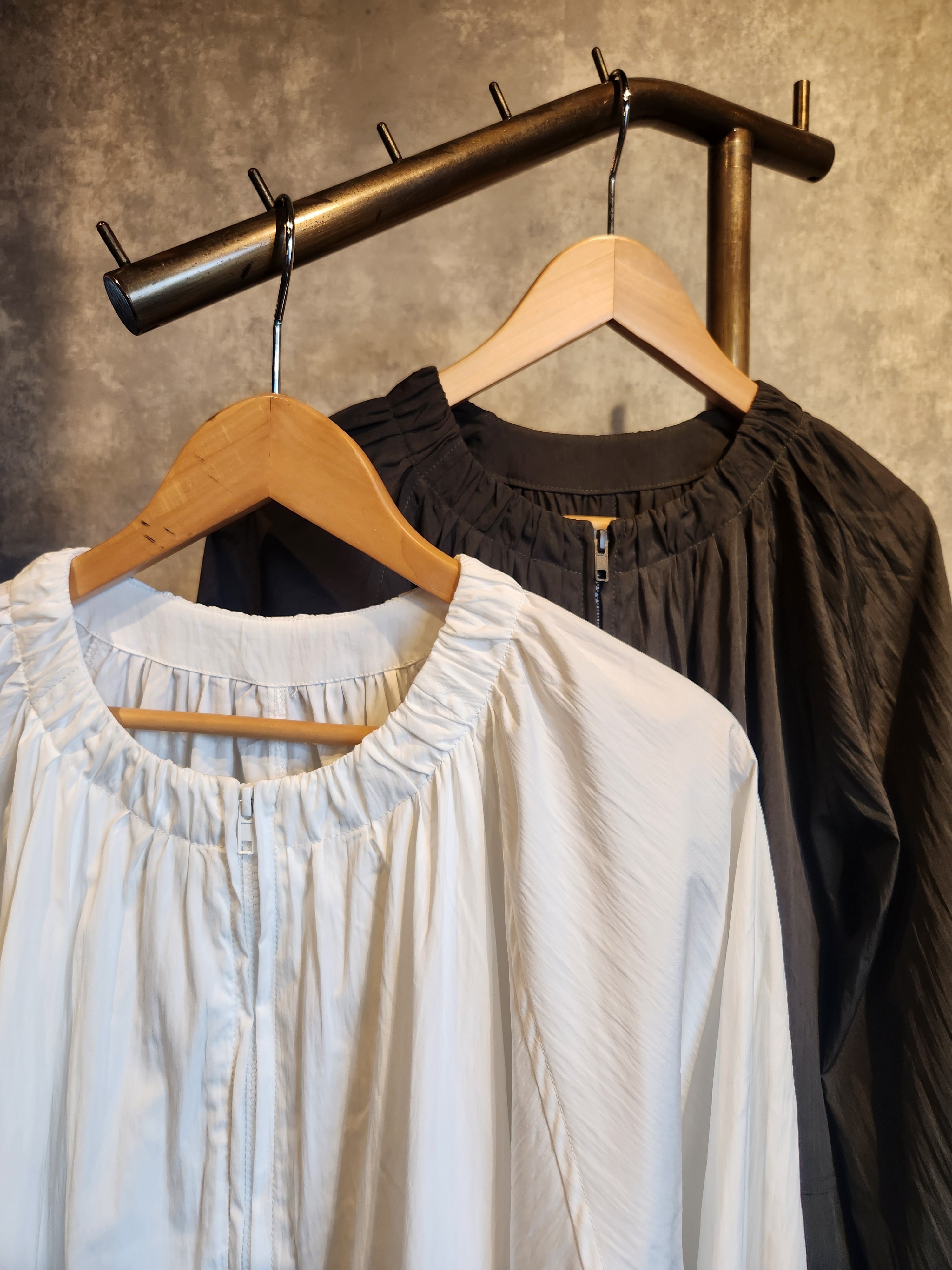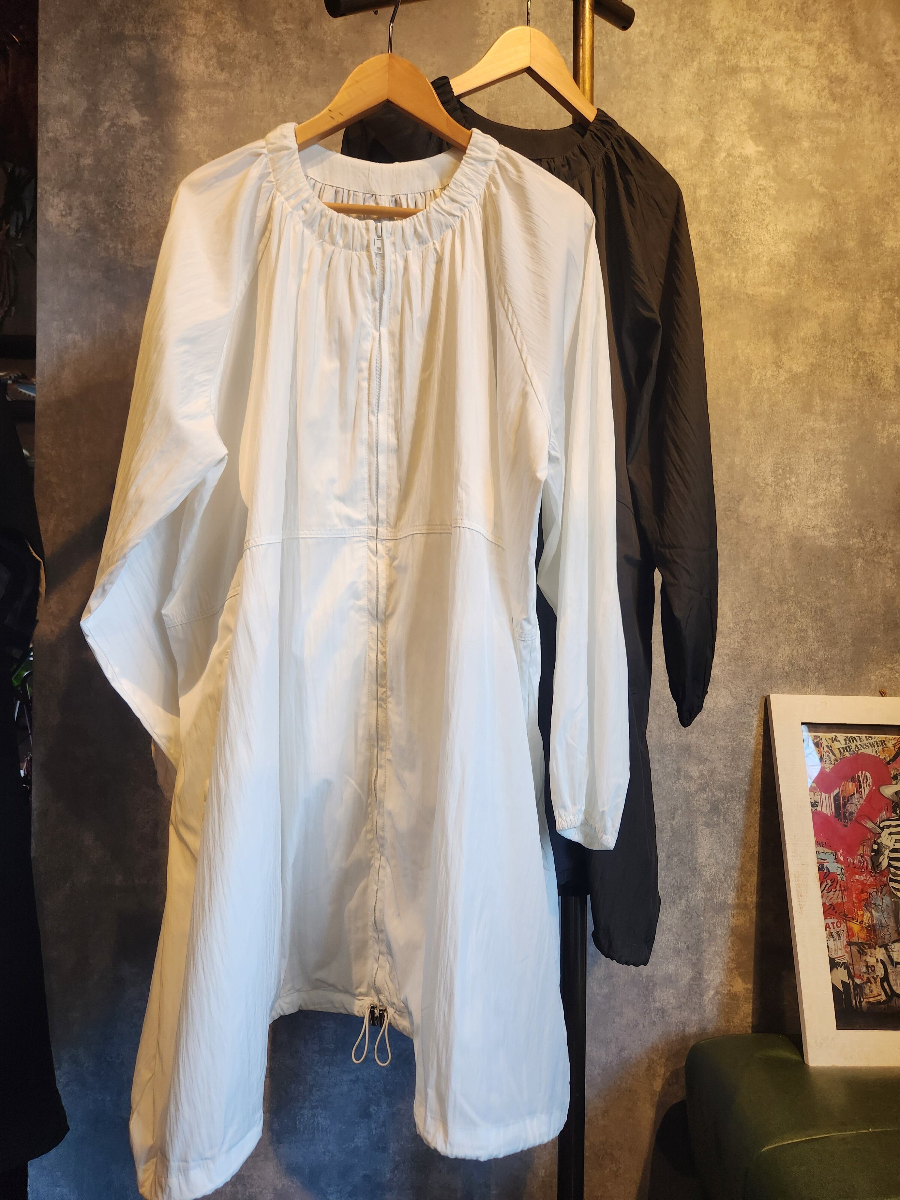 裾のドロストコードでコクーンのようにシルエット調整できます