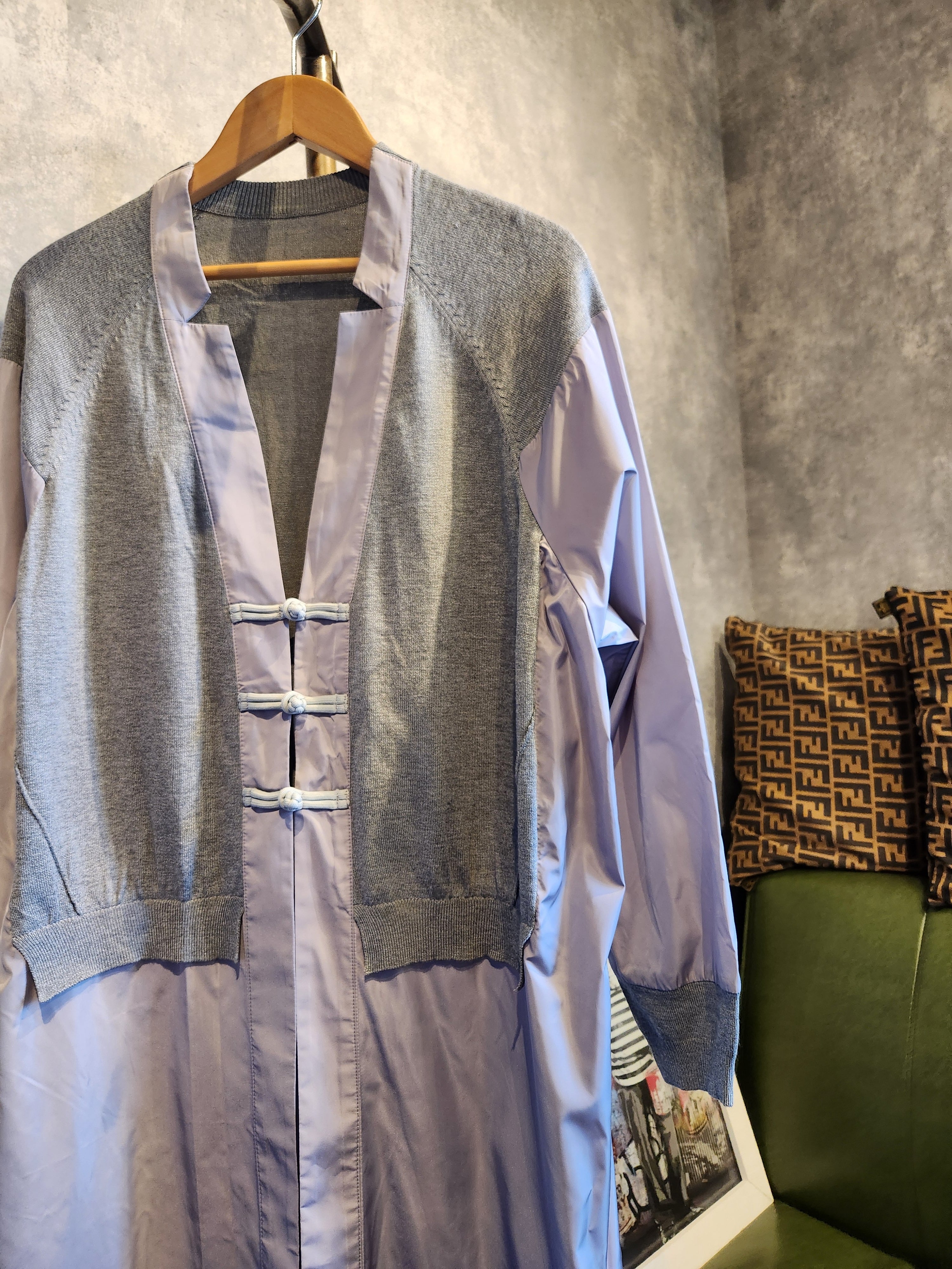 アイスグレー色の光沢感ありなロングカーディガンに異素材のニットをベスト風にドッキングした1枚。