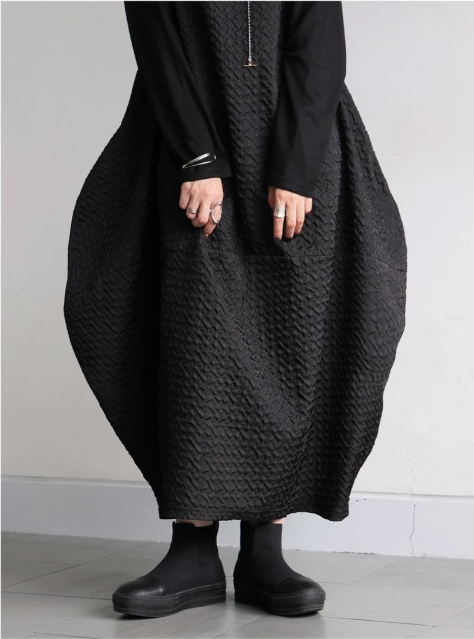 立体的なフォルムが特徴のコクーンシルエットに、異なる質感を組み合わせたデザインが唯一無二の存在感を放ちます。