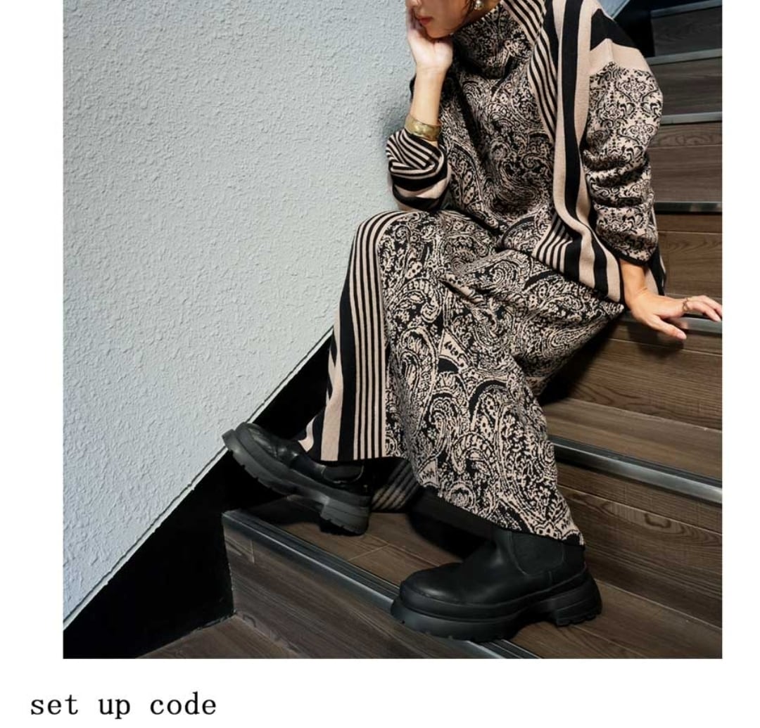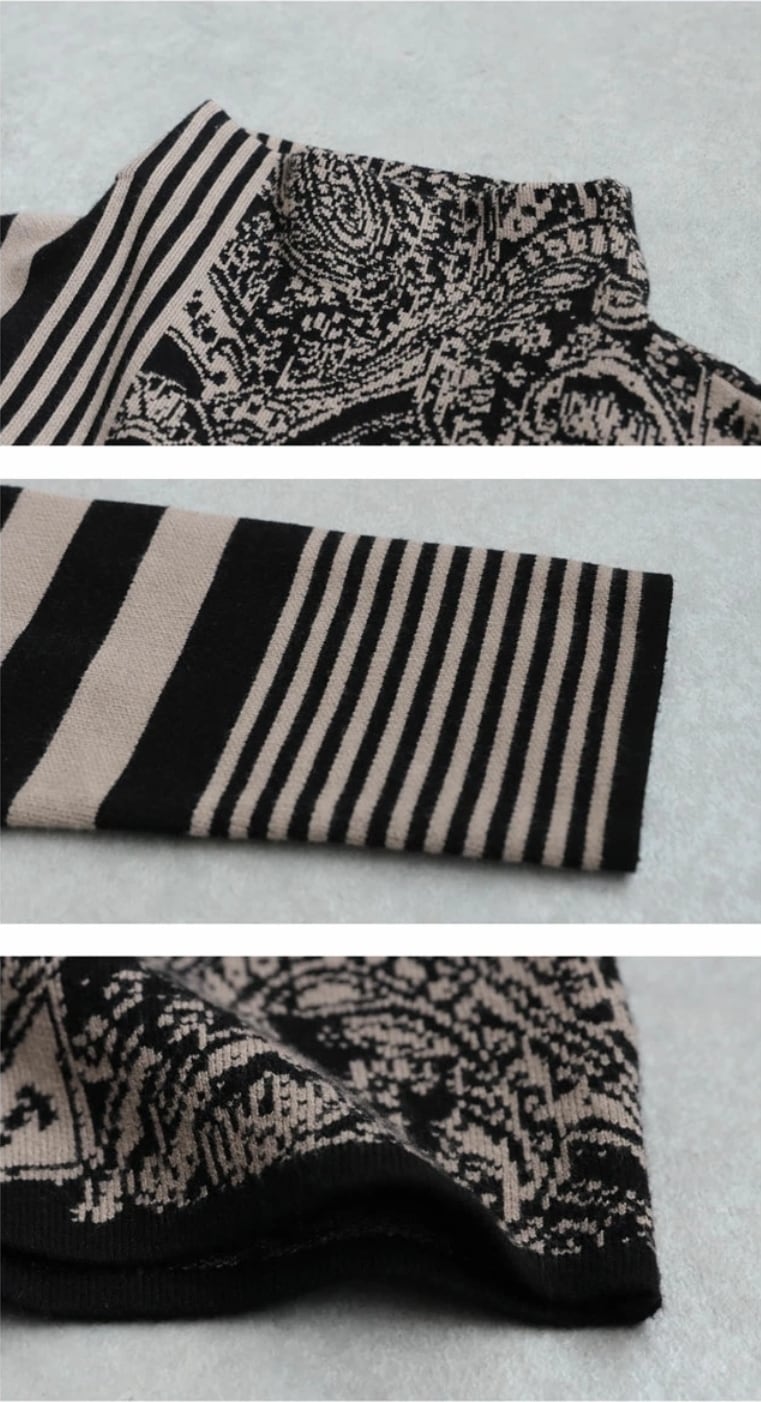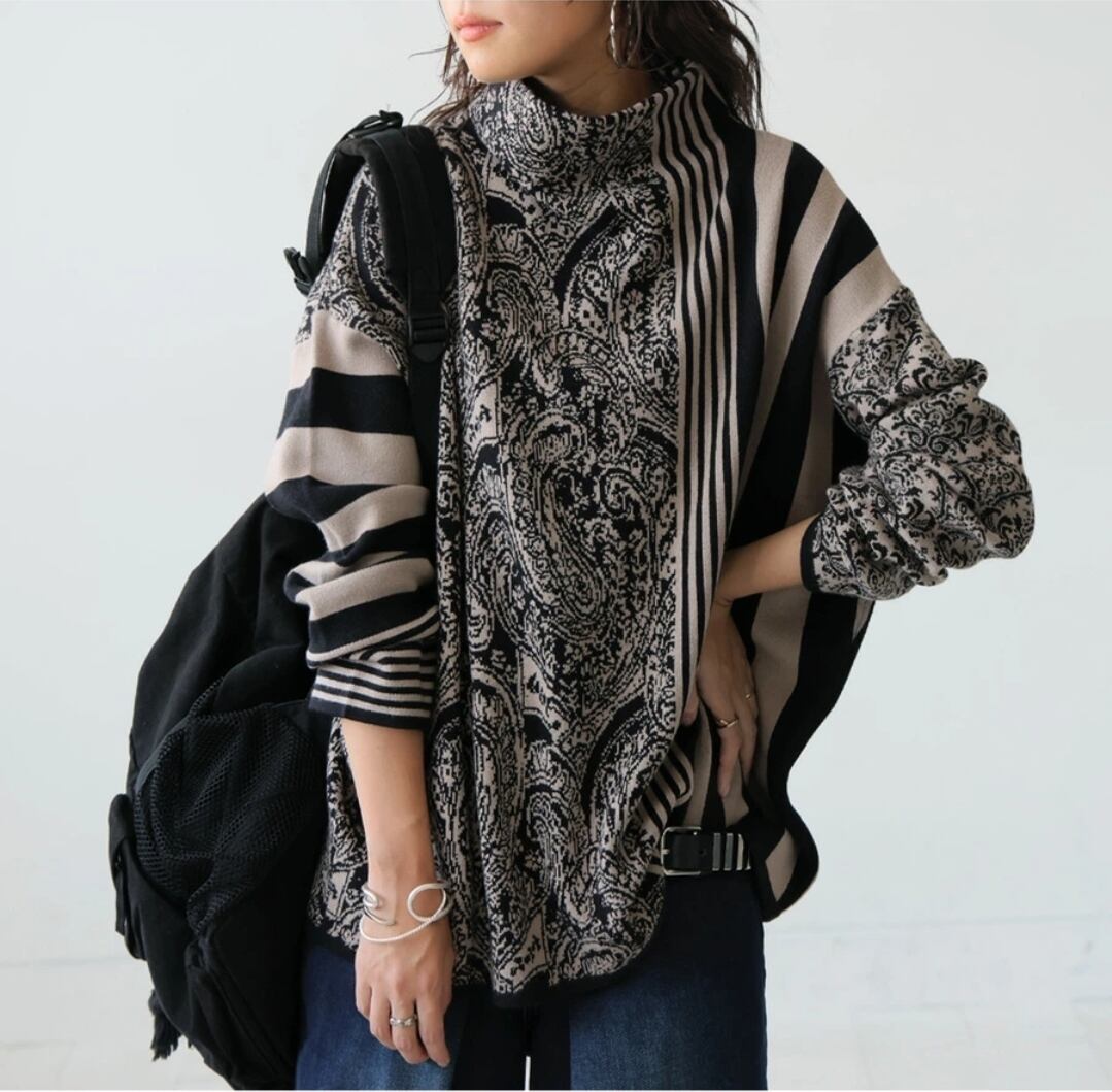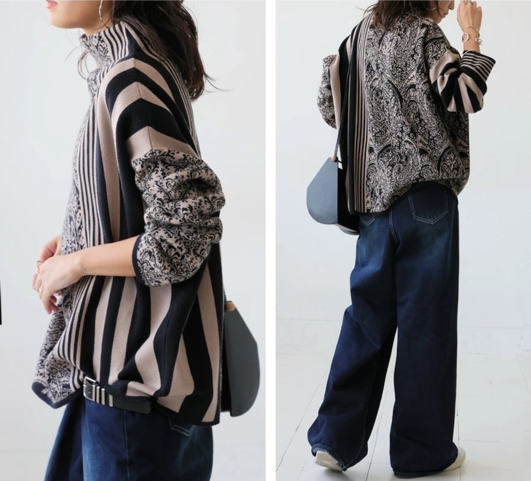 視線を惹きつける柄ミックスデザインが印象的な、大人のための柄ニットトップス。