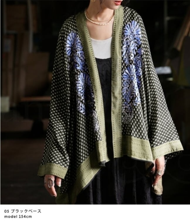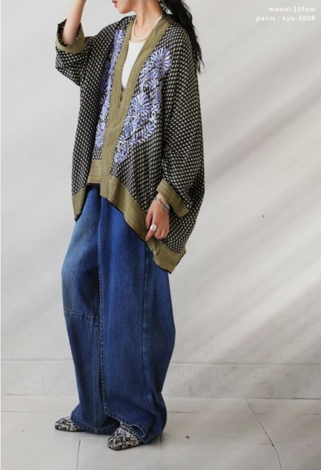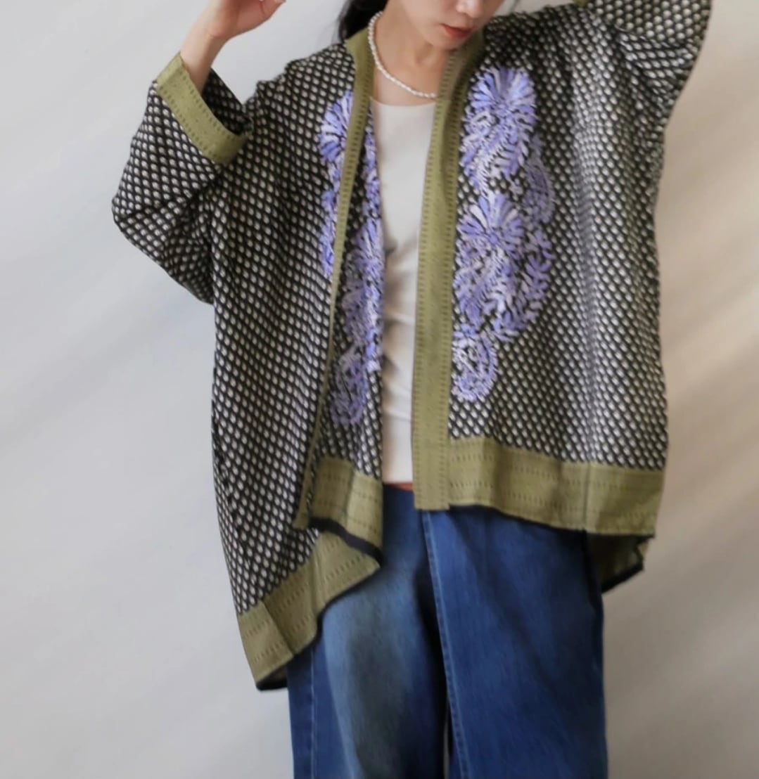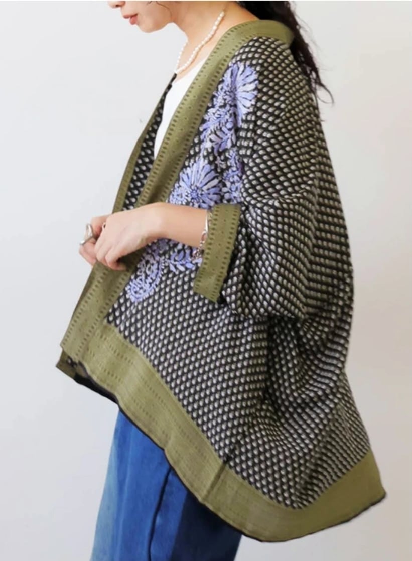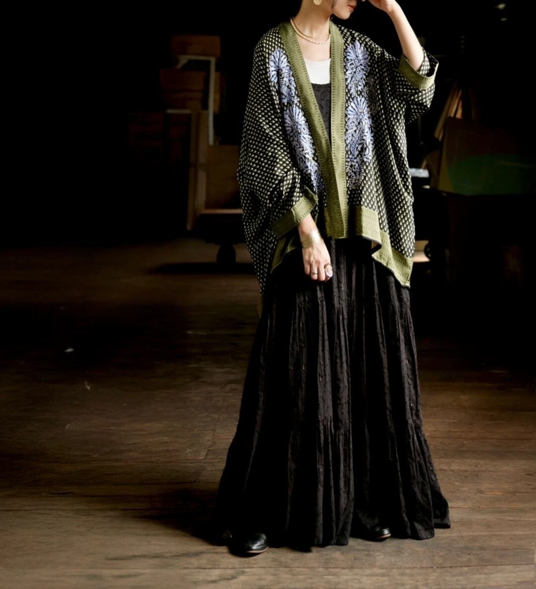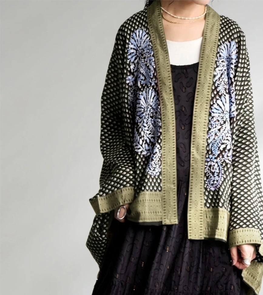 ちょっとしたお出かけにも、旅先のリラックススタイルにも活躍する、華やかで特別感のある羽織りです。