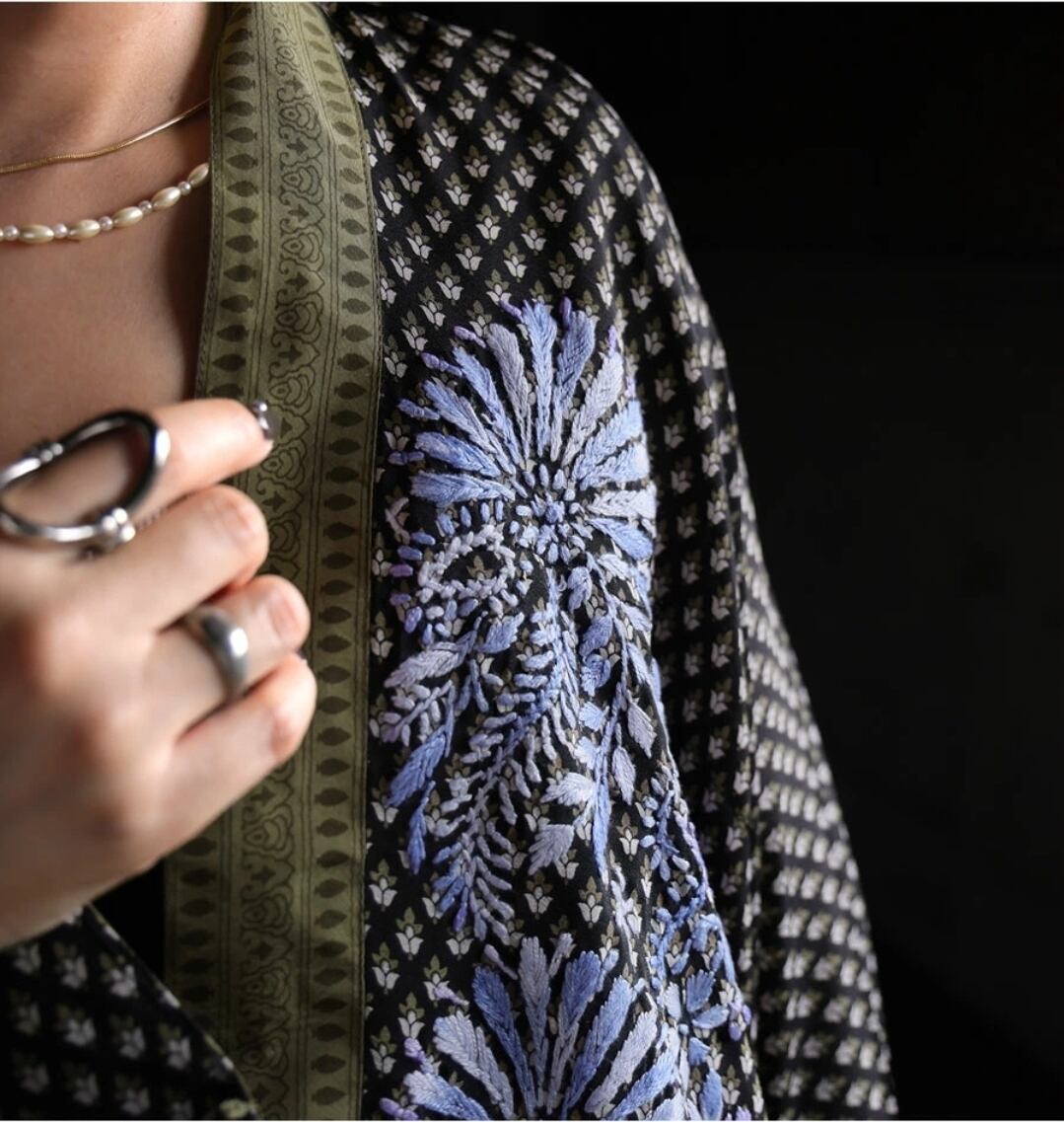 繊細な刺繍は、インド・ラクナウ地方の職人によるハンドメイド。1枚の仕上げに3日かかるほど、丁寧に作られた特別な一枚です。