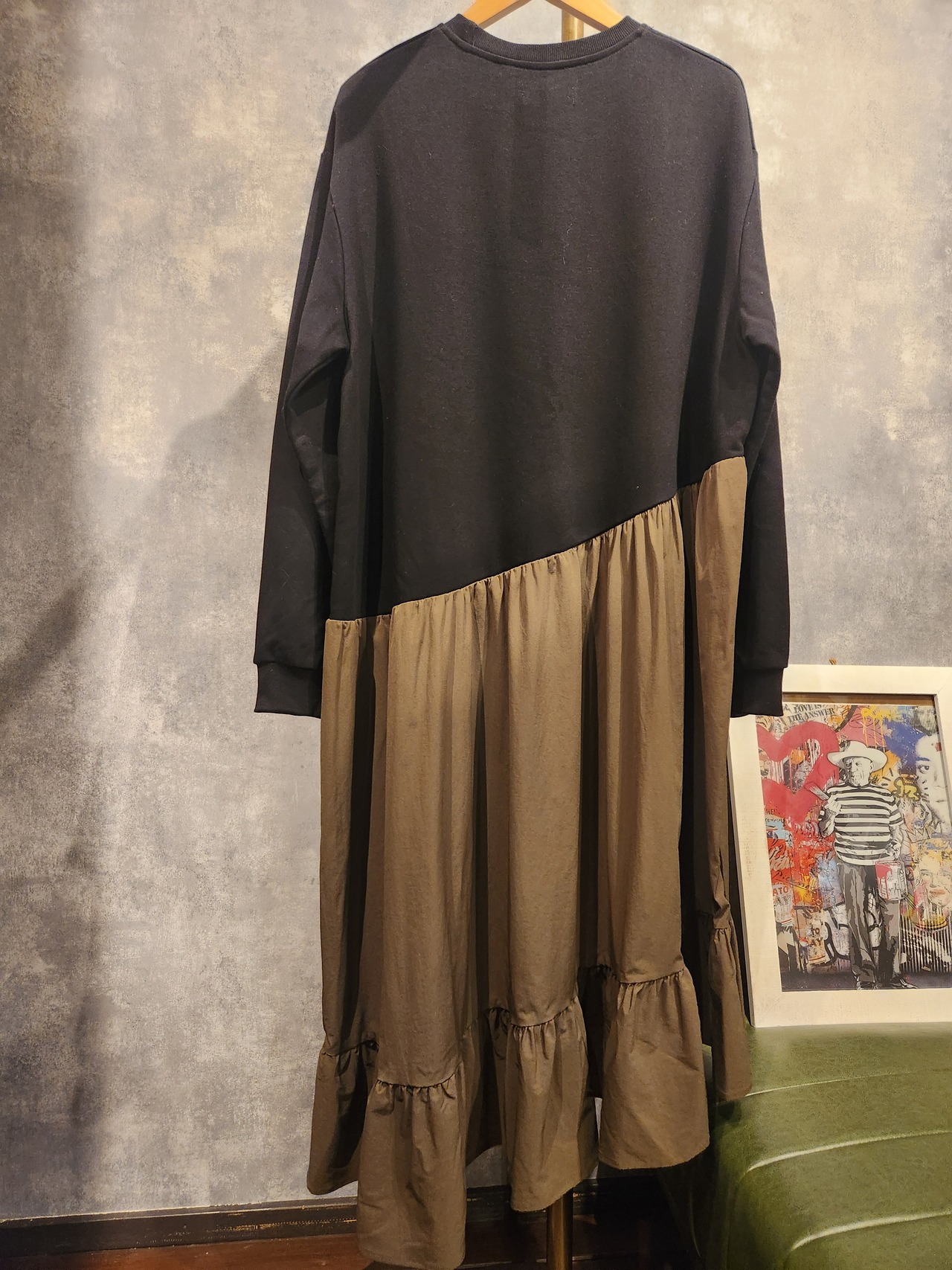 斜めの切り替えが特徴的なアシンメトリーデザインで、さりげなく個性を演出できるワンピース。カットソーと布帛を絶妙に組み合わせたドッキング仕様が、1枚でスタイリングを完成させるポイントに。裾のフリルが女性らしい動きをプラスし、シンプルながらも洗練された印象に仕上げます。忙しい日でもさらっと着るだけでおしゃれ見えする万能なアイテムです。