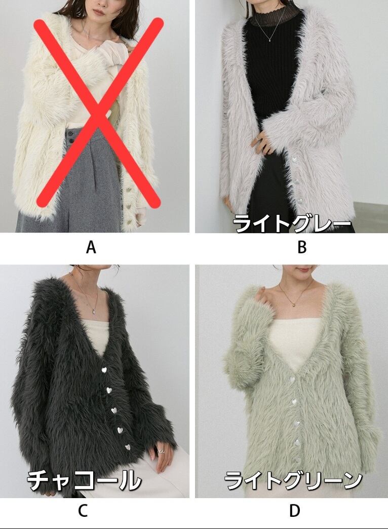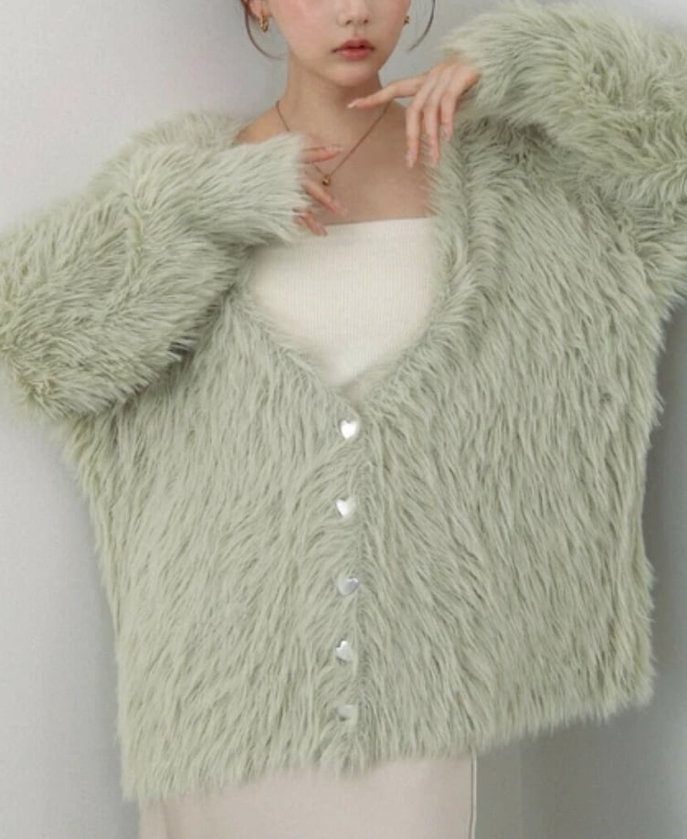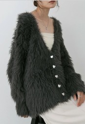 ボタン部分はハートになっていてガーリーな一面もあるカーディガンは、この秋冬大活躍すること間違いなしです。アイボリーのみボタン部分がゴールドに、そのほかのカラーはシルバーになっています。ふわっとしていて暖かいシャギーが着るだけでフェミニンな印象を与えます。