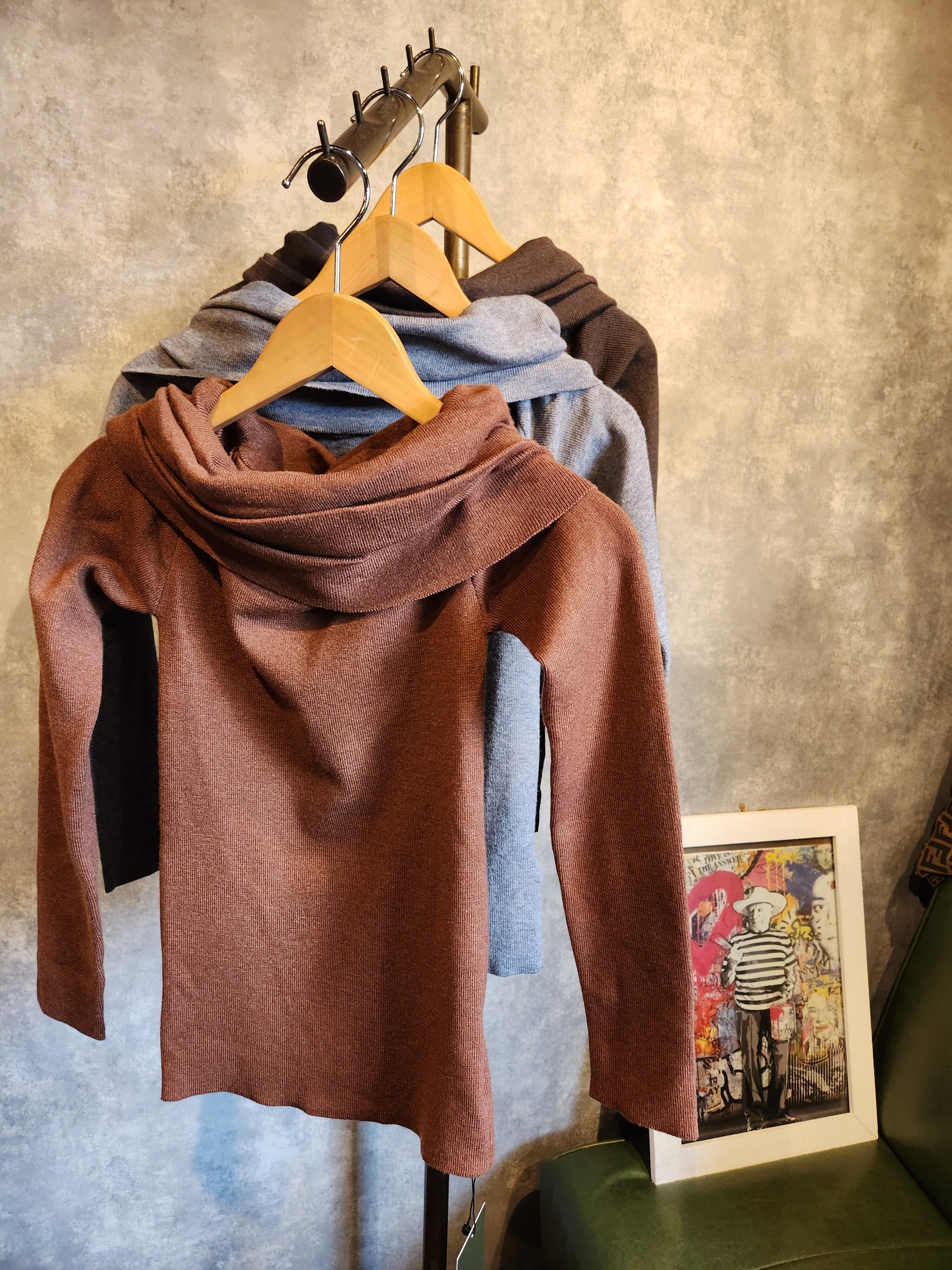 両サイドにギャザーを入れドレープデザインが美しいニット。