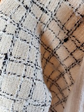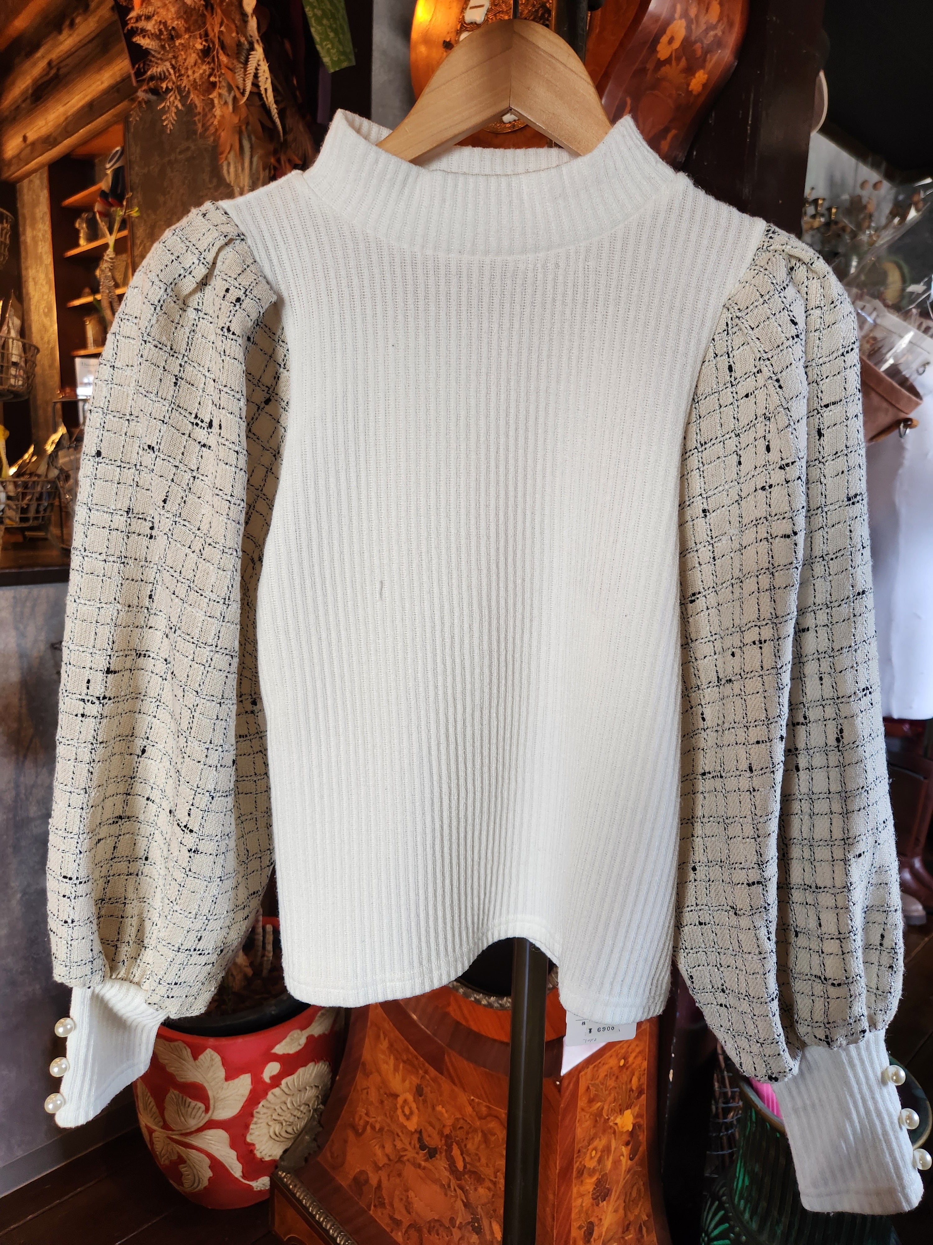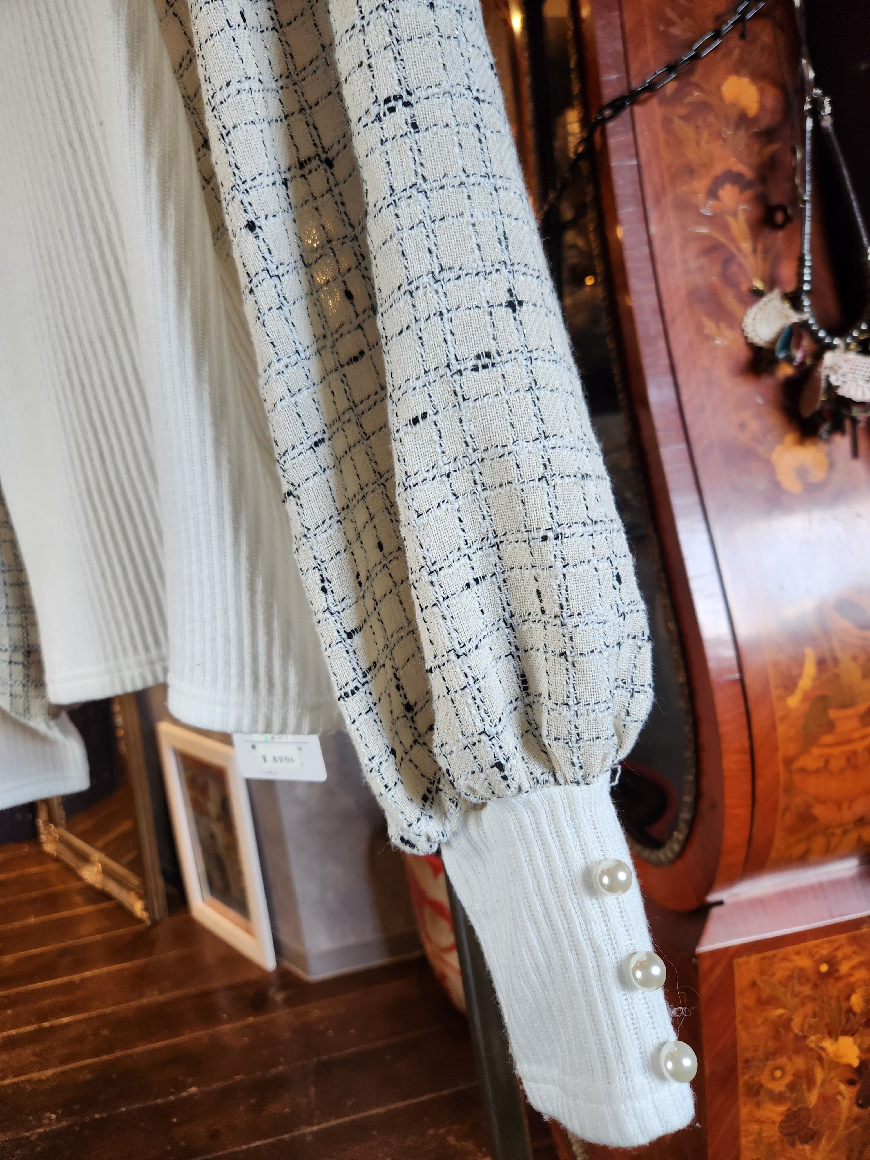 チェック柄のボリューム袖部分はゴールドの糸が使われているため、キラキラして上品です