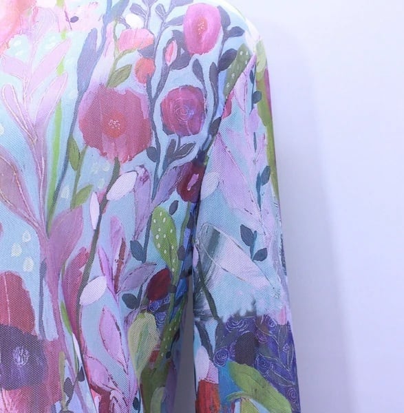 ふんわりとしたエアリーなネット素材に、華やかな柄をあしらったハイネックトップス。