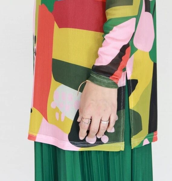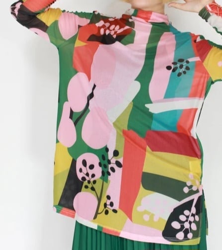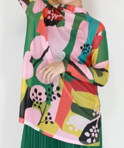 鮮やかなマルチカラーと、アートのような模様が華やかさアップ↑、目を引くトップスです。