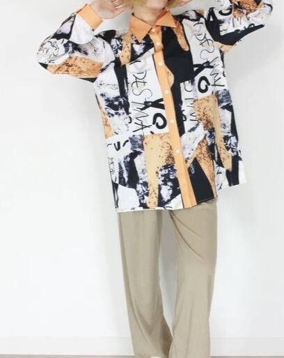 丈長め・衿付きはレイヤードにもジャケットのインナーにも使えて、総柄でもラフになりすぎない、きちんと感のある一枚。