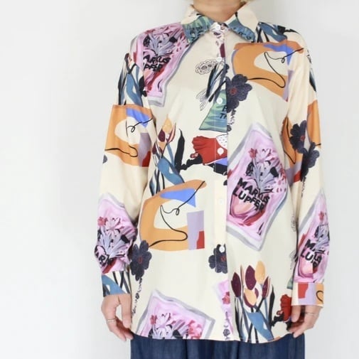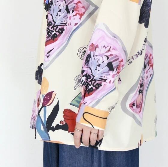 丈長め・衿付きはレイヤードにもジャケットのインナーにも使えて、総柄でもラフになりすぎない、きちんと感のある一枚。