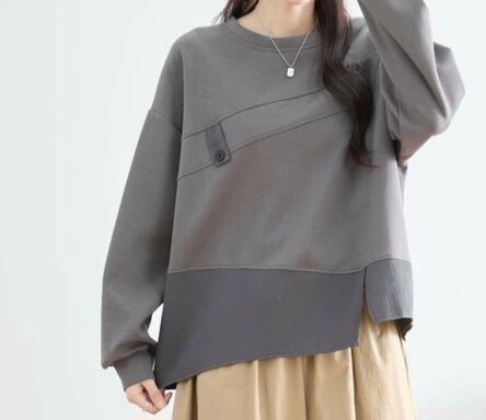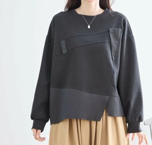 フロントに大胆な切り替えラインとボタンディテールをあしらった、モード感あふれるスウェットトップス。