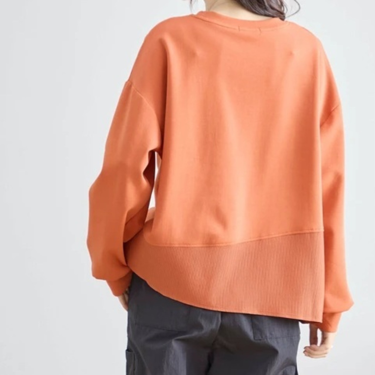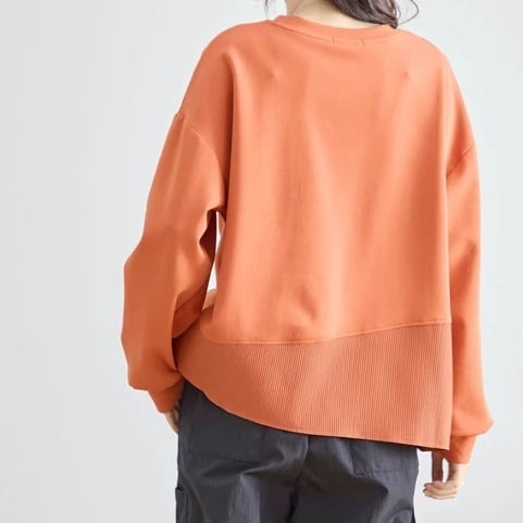 裾部分はリブ風の素材切り替えで、アシンメトリーなデザインで動きをプラス。シンプルながら個性を引き立てる1枚です。