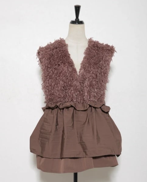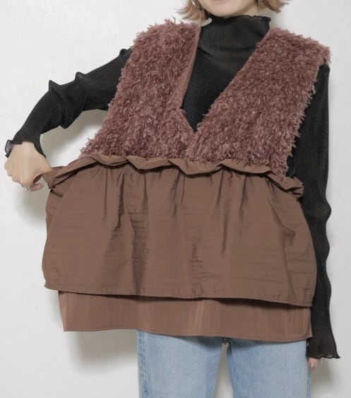大きく開いた前後Vネックと異素材使いがトレンド感のあるベスト☆