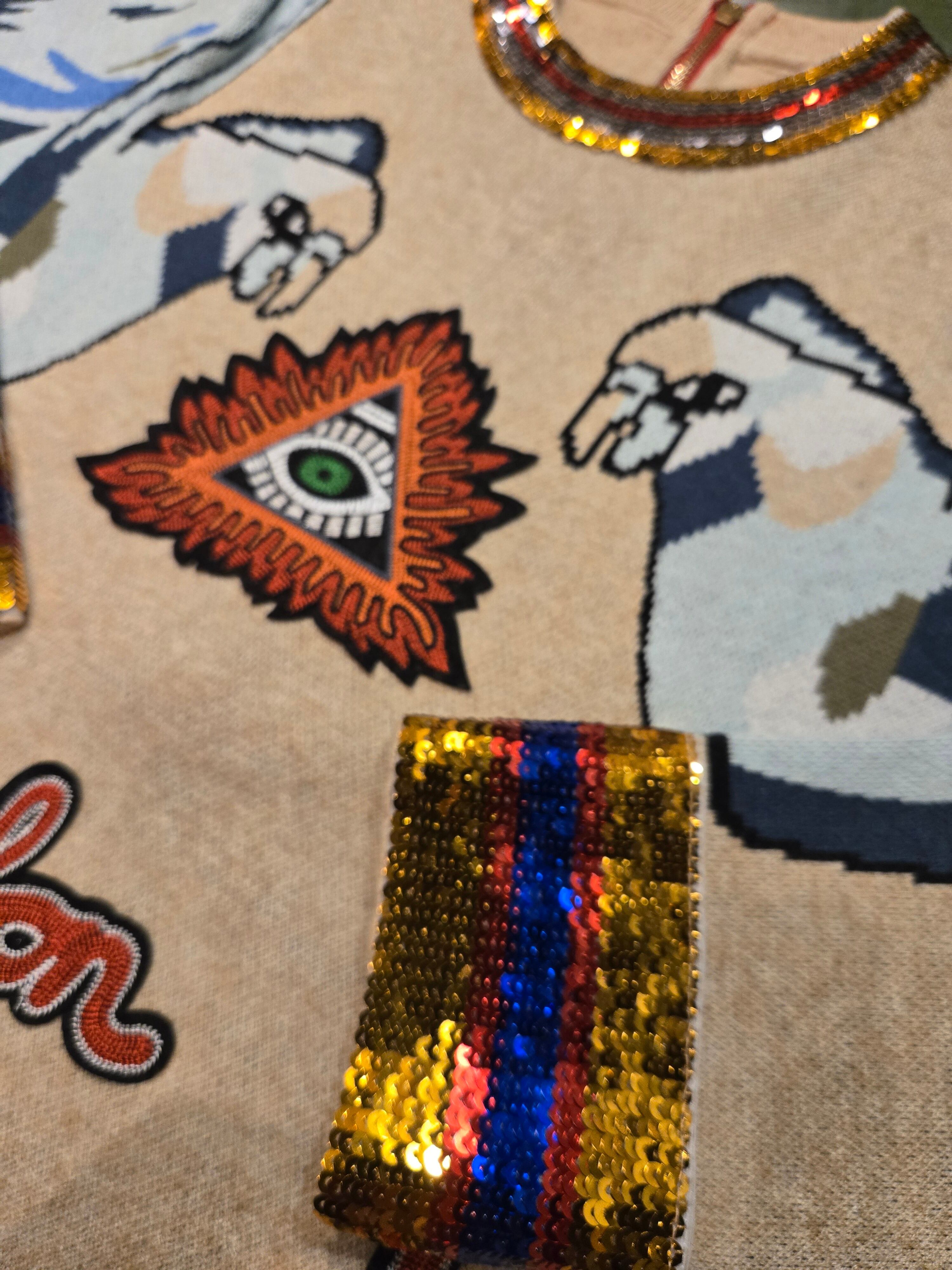 インパクト最大級のスパンコールがギラついたニットトップスです。