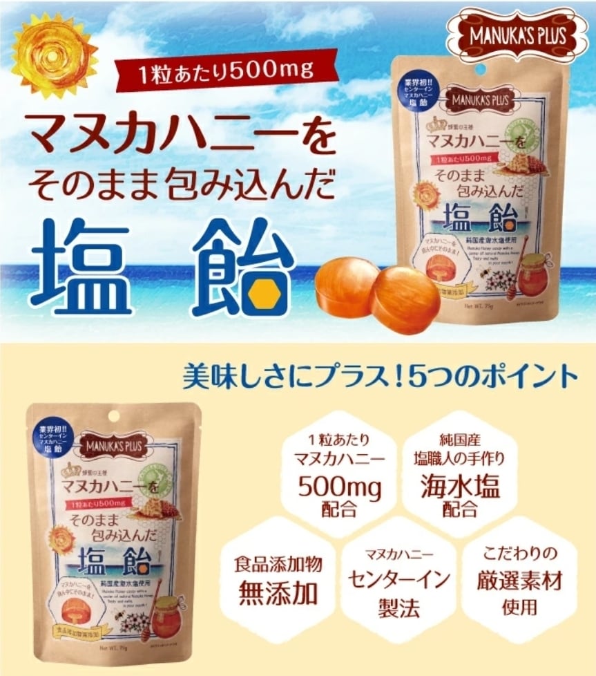 国産の水飴にマヌカハニーを練りこんだセンターイン製法の健康塩飴です。