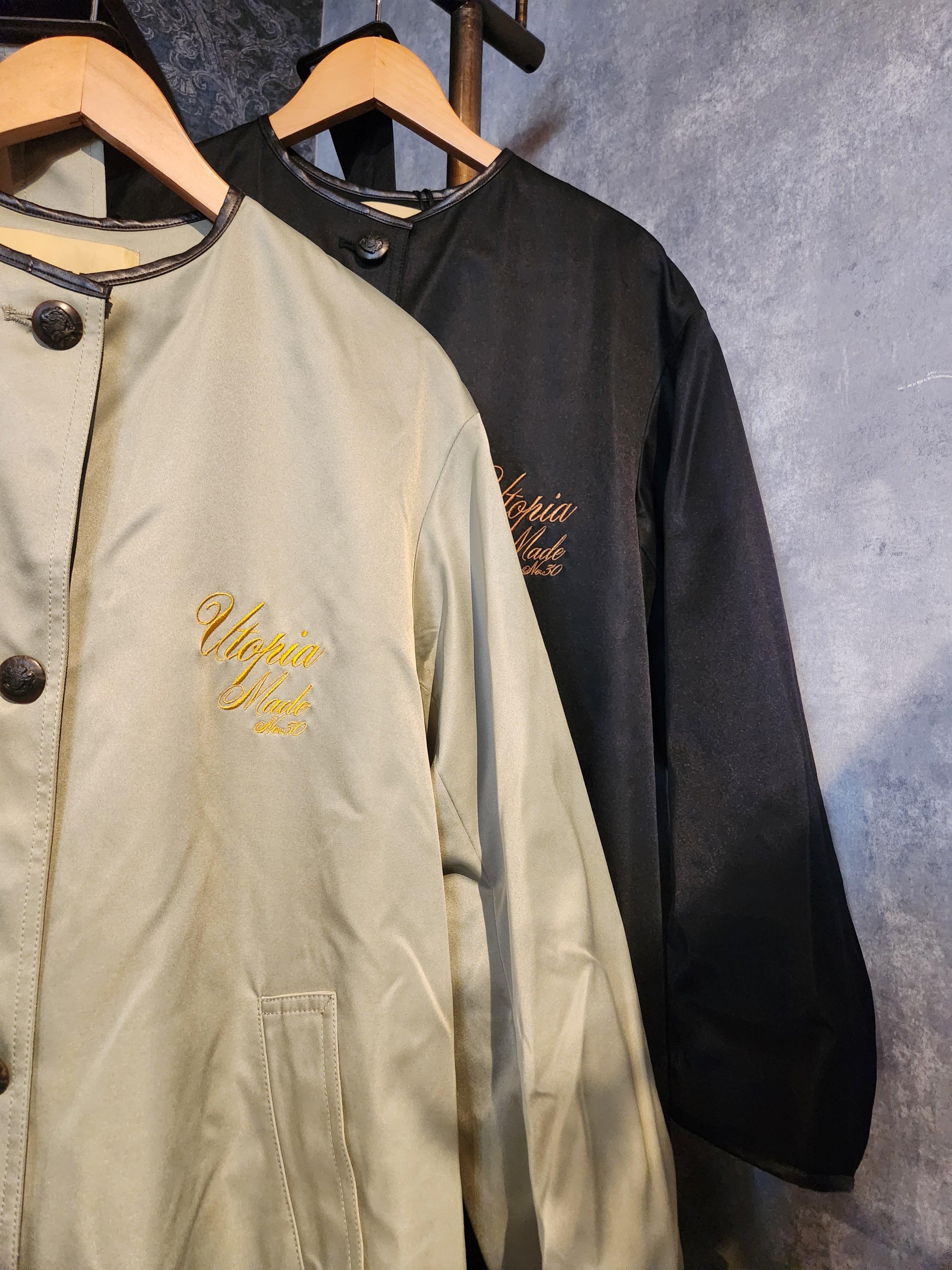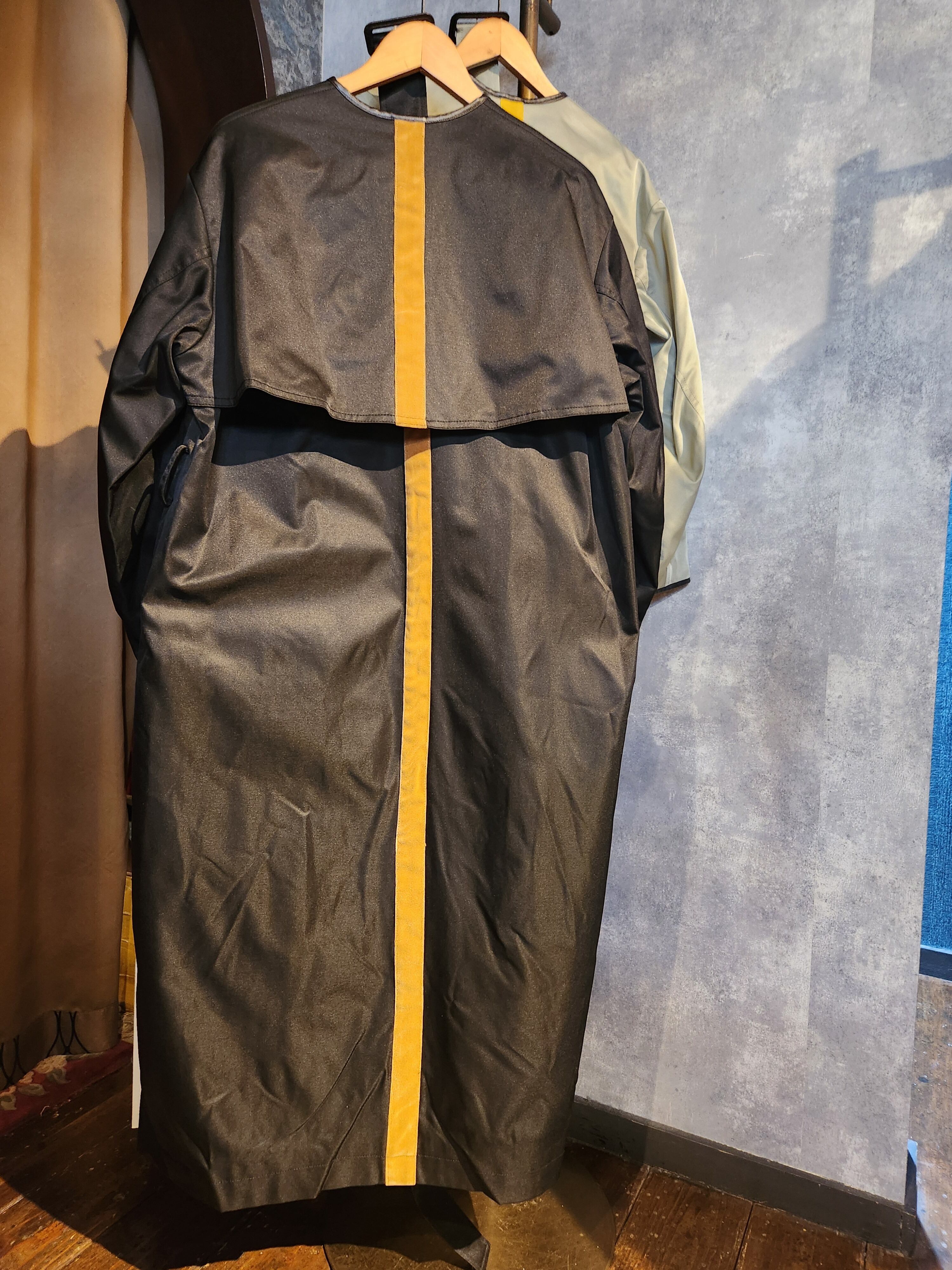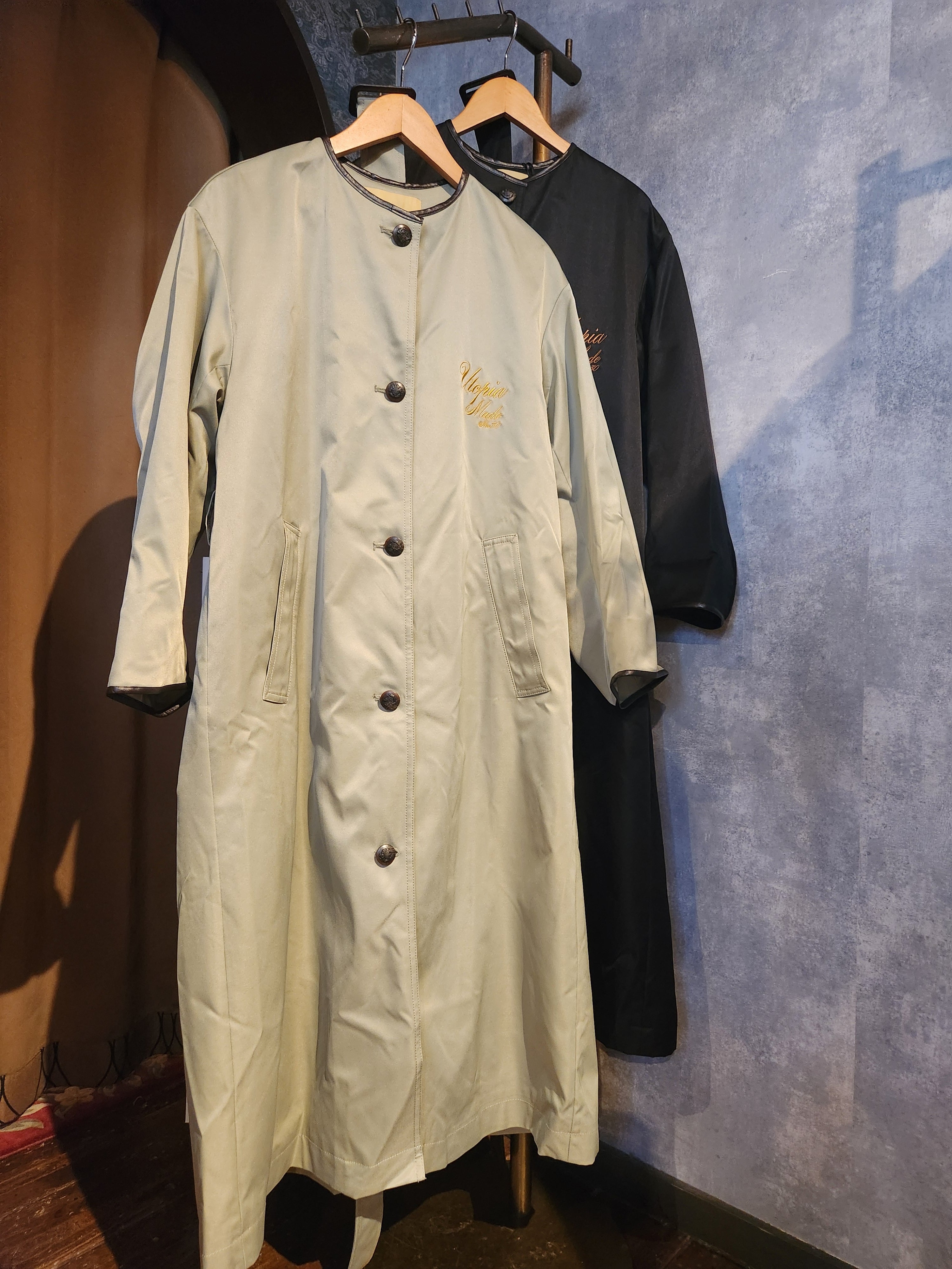 背中にベロア生地のラインテープが目を惹くノーカラーのトレンチコート。