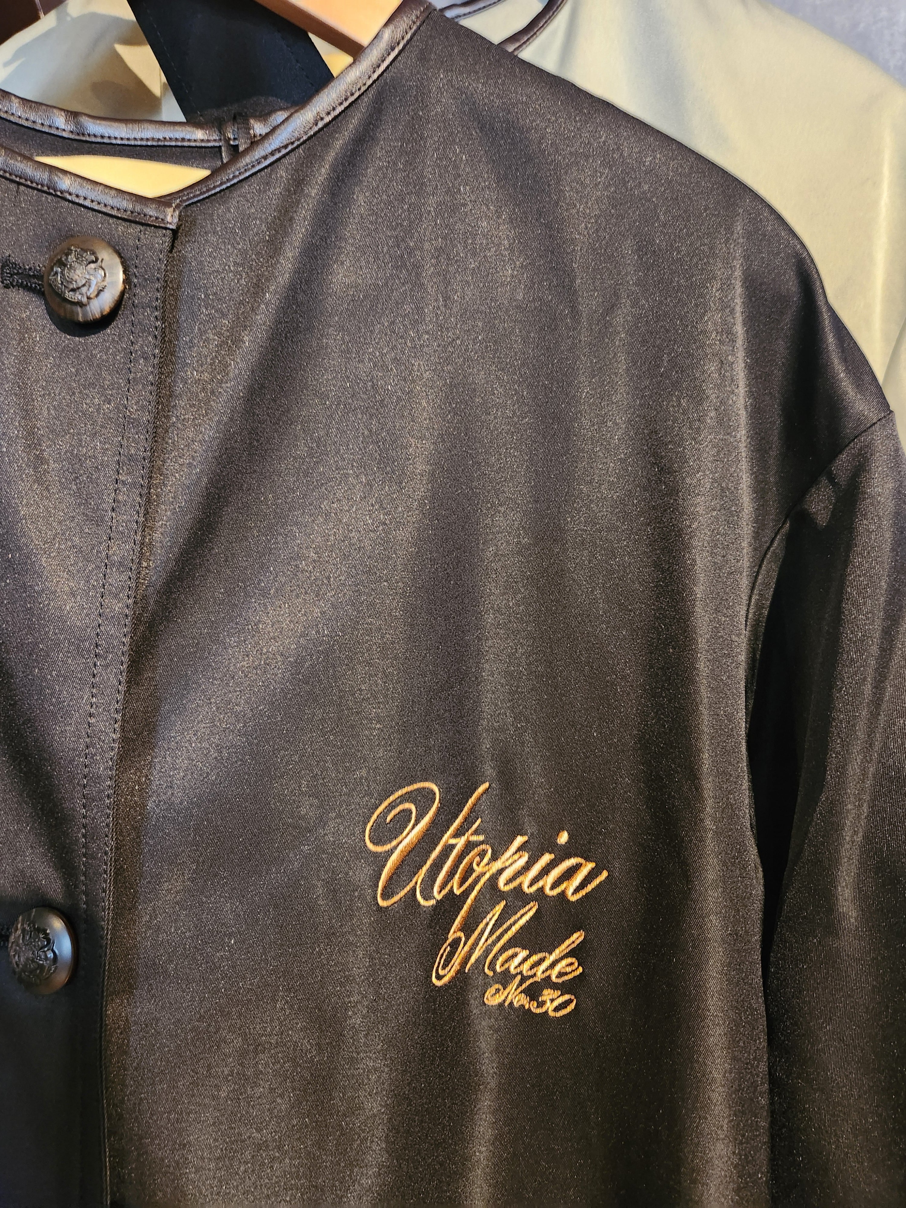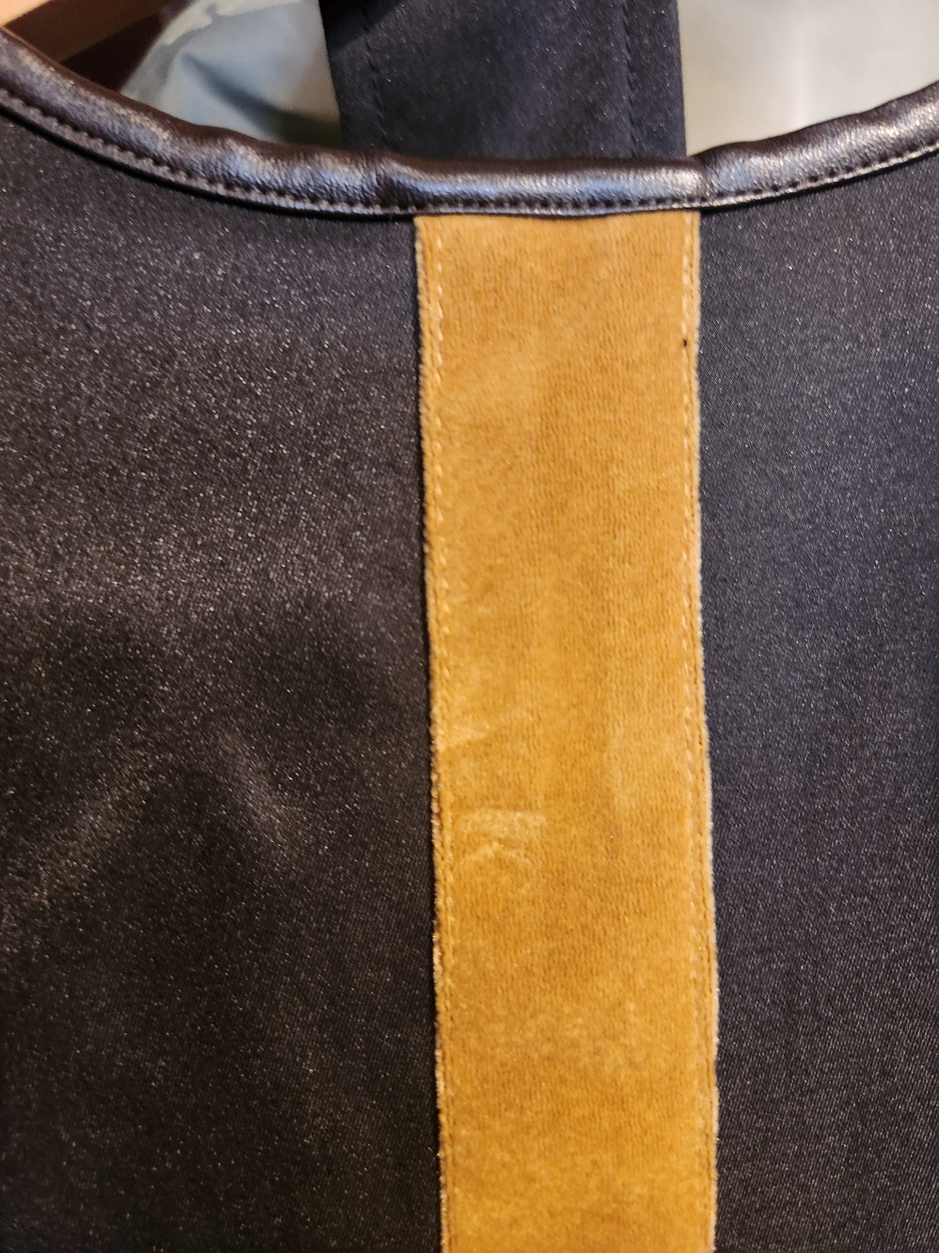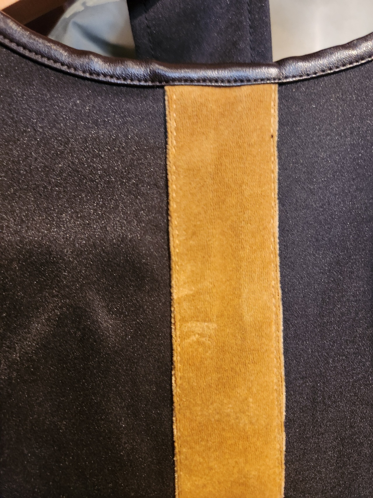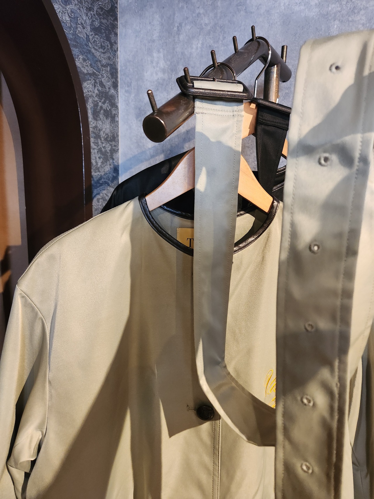 背中にベロア生地のラインテープが目を惹くノーカラーのトレンチコート。
