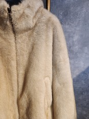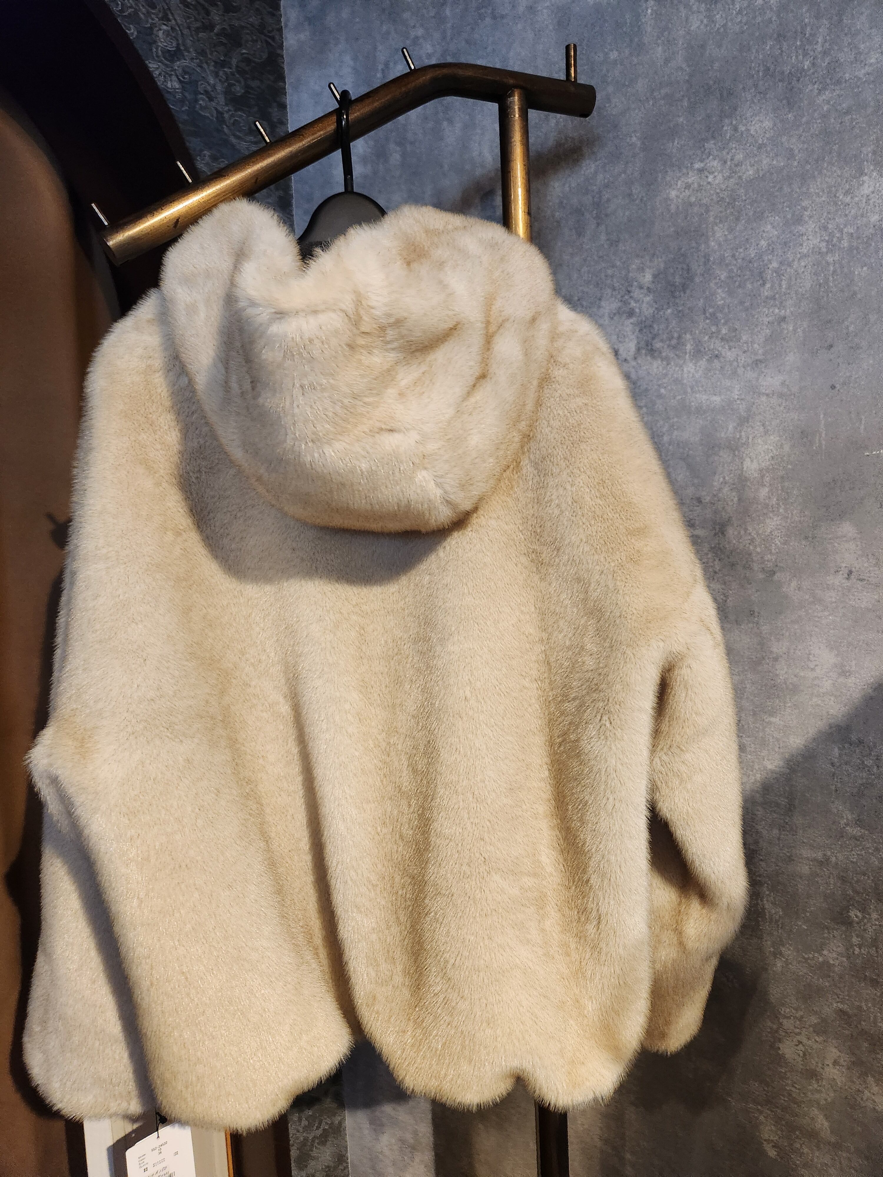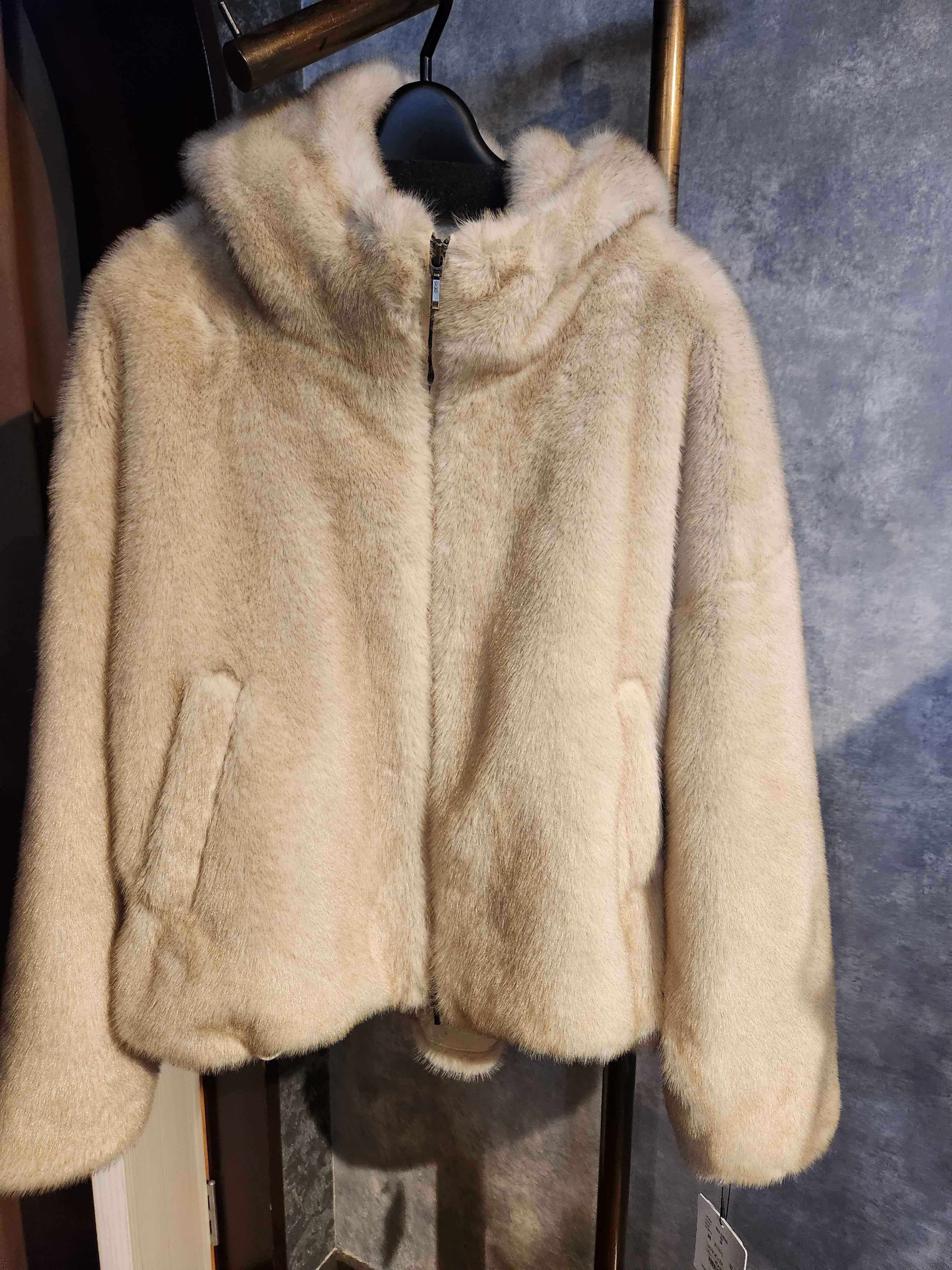 柔らかいベージュカラーのファーが上品さとフーディのカジュアル感がミックスされたアウター