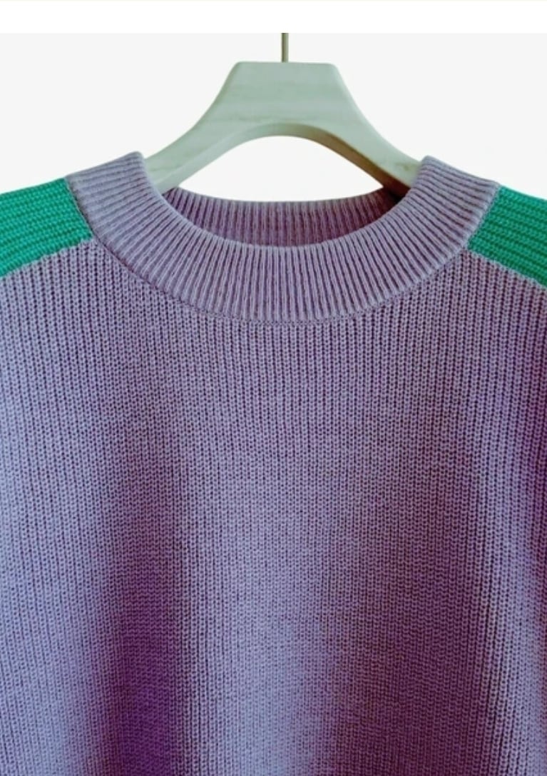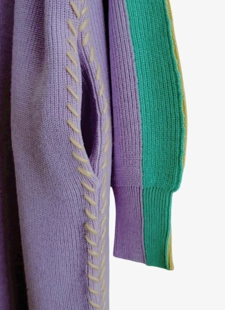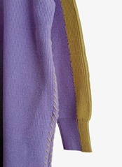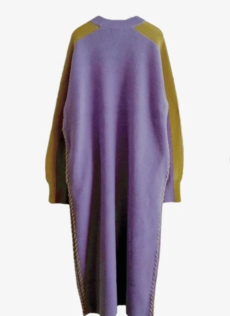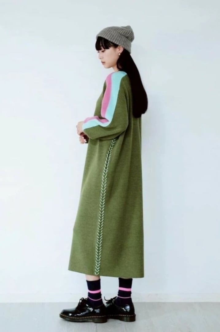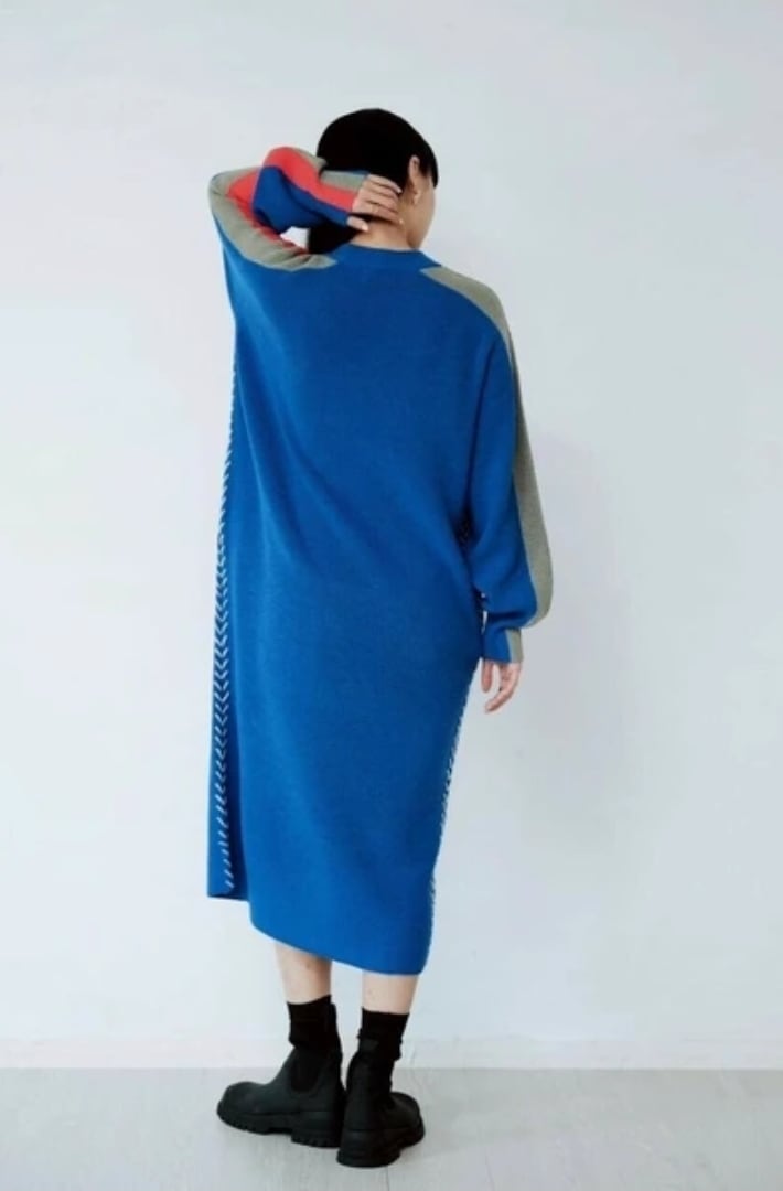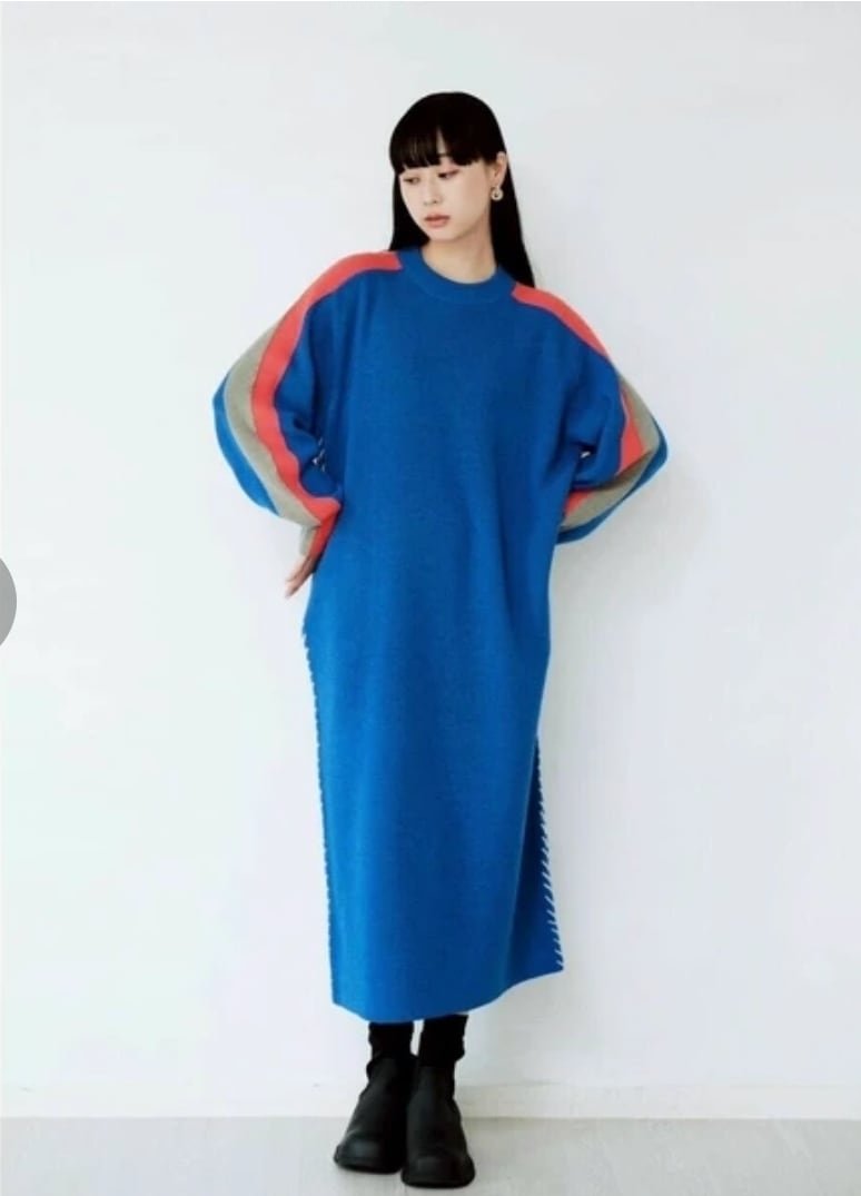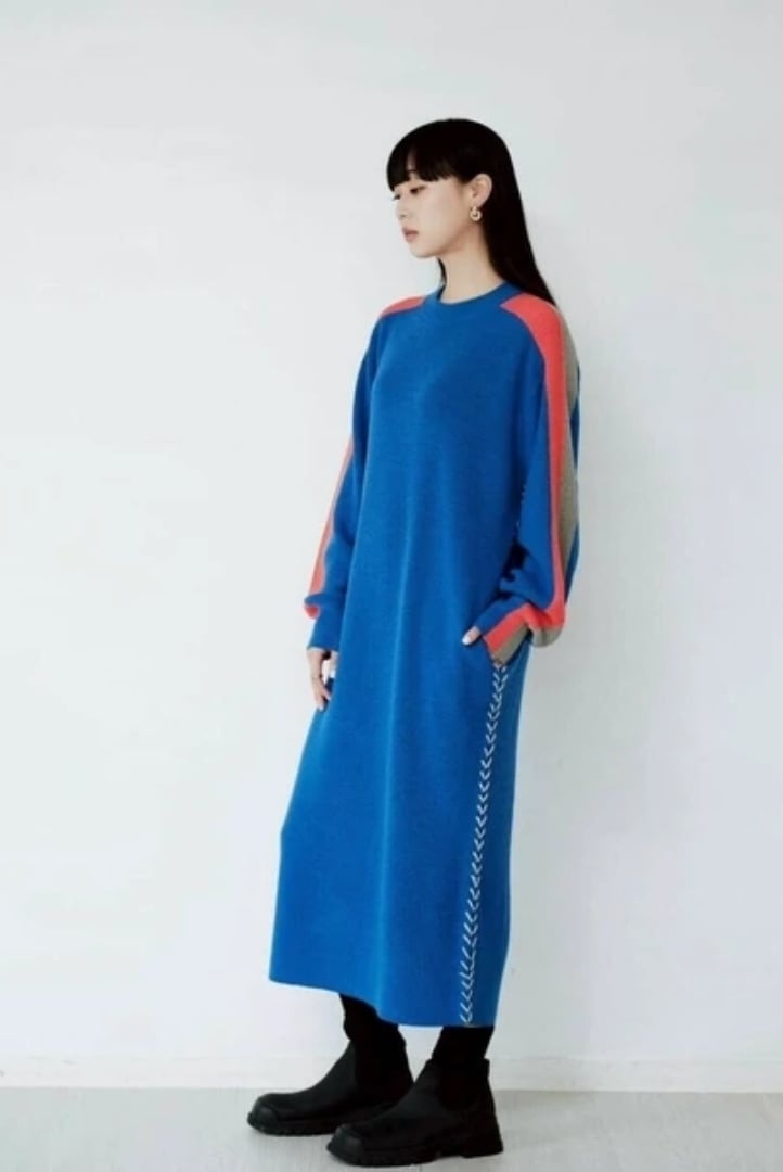 袖の配⾊とサイドに⼊ったステッチデザインがポイントのニットワンピース。