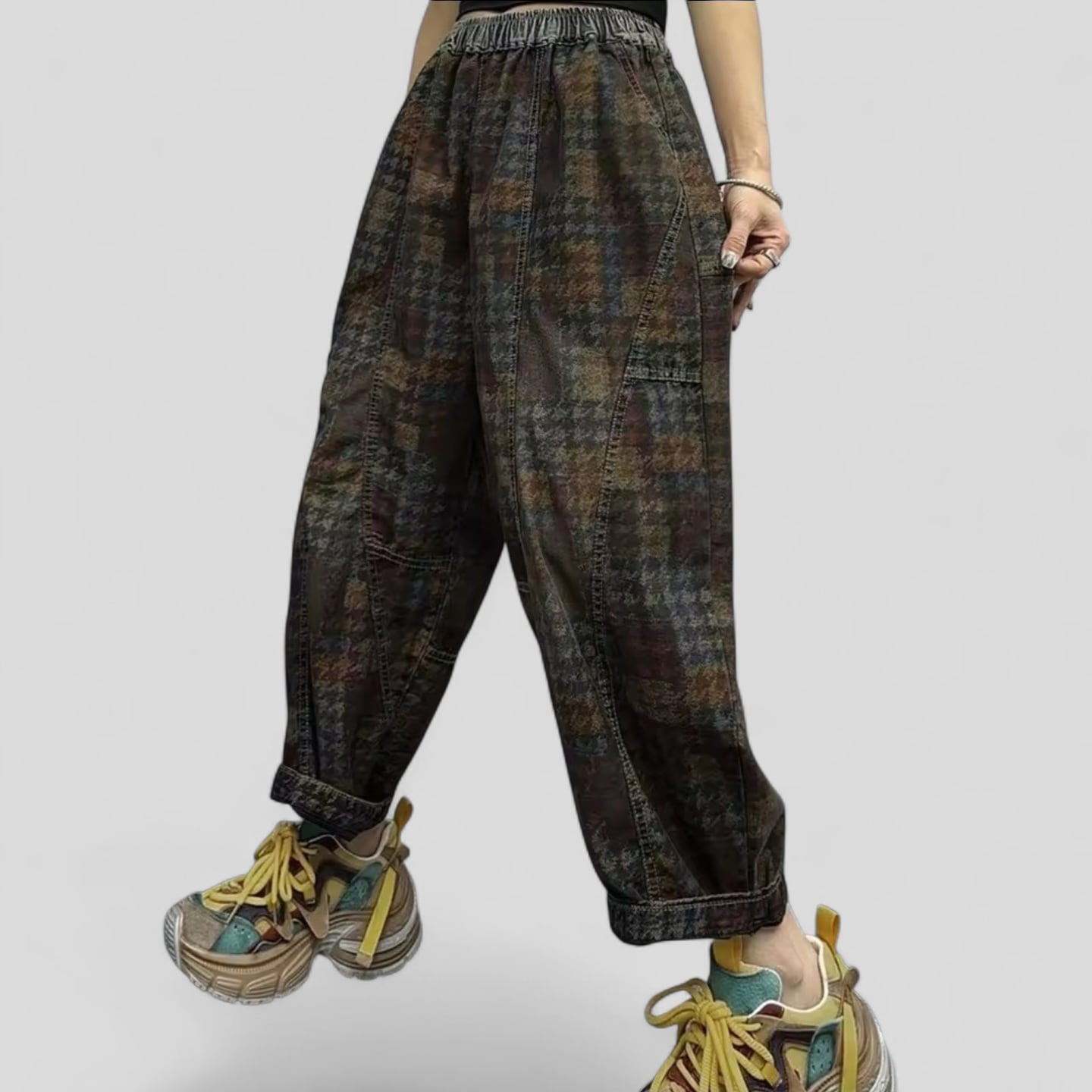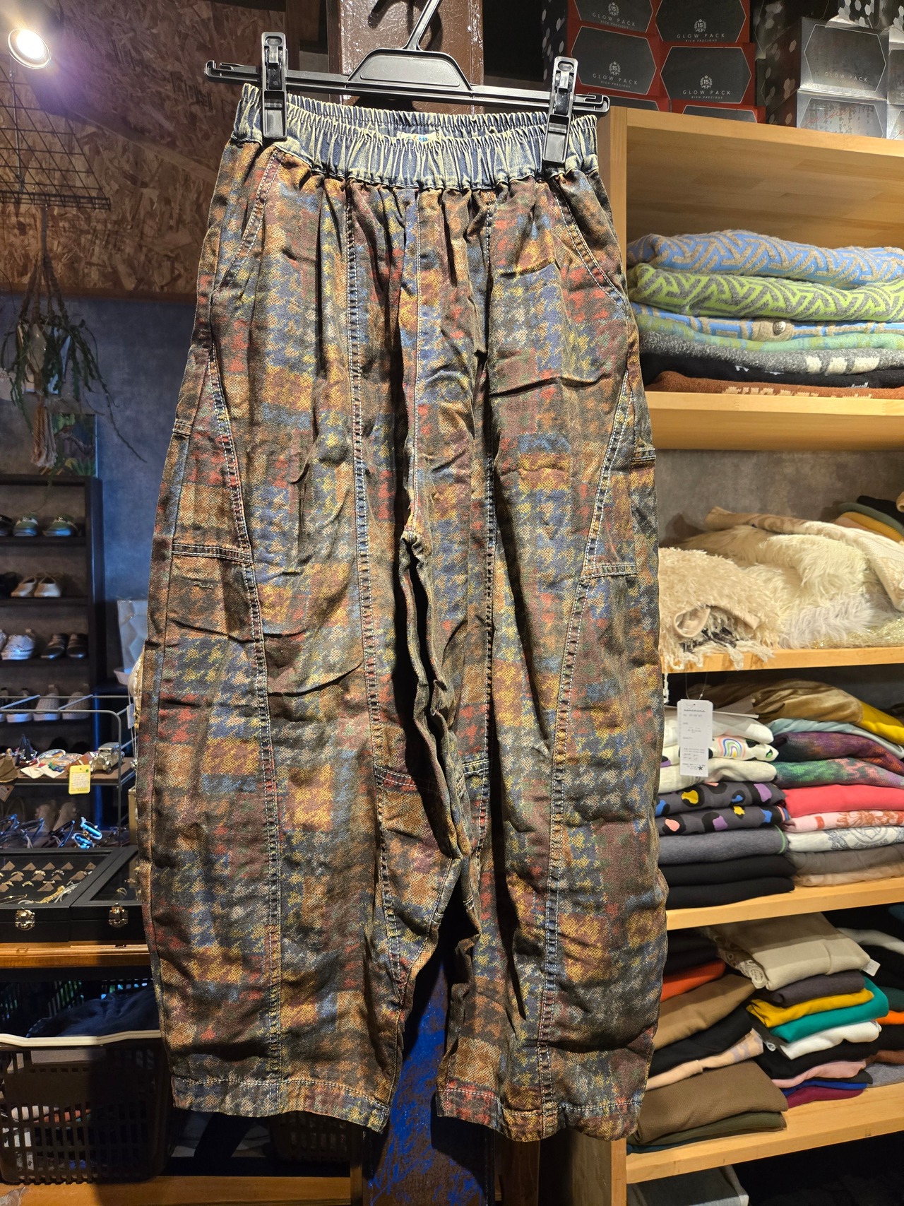 ダークトーンの色の配色が可愛いウエストゴムの楽チンデニム系パンツです。