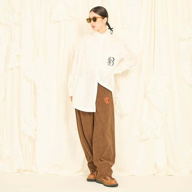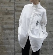 フリル付きのハイネックオーバーサイズシャツをデザインしました。