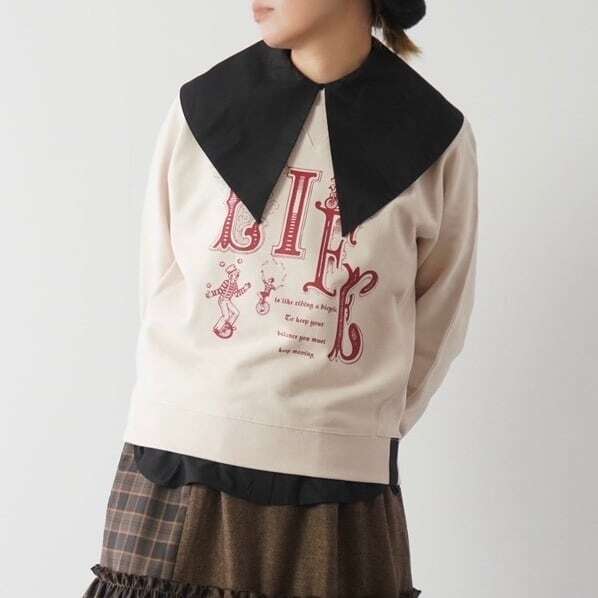 やや短めの着丈で身頃はゆったり、スカートや小柄な方にもバランスよく着られます。裏パイルで軽く着心地も快適。コットン×ポリエステル混紡で見た目はコットン100%の風合い。遊園地をテーマにした遊び心あふれるデザインで、顔映りの良いカラーが魅力です。