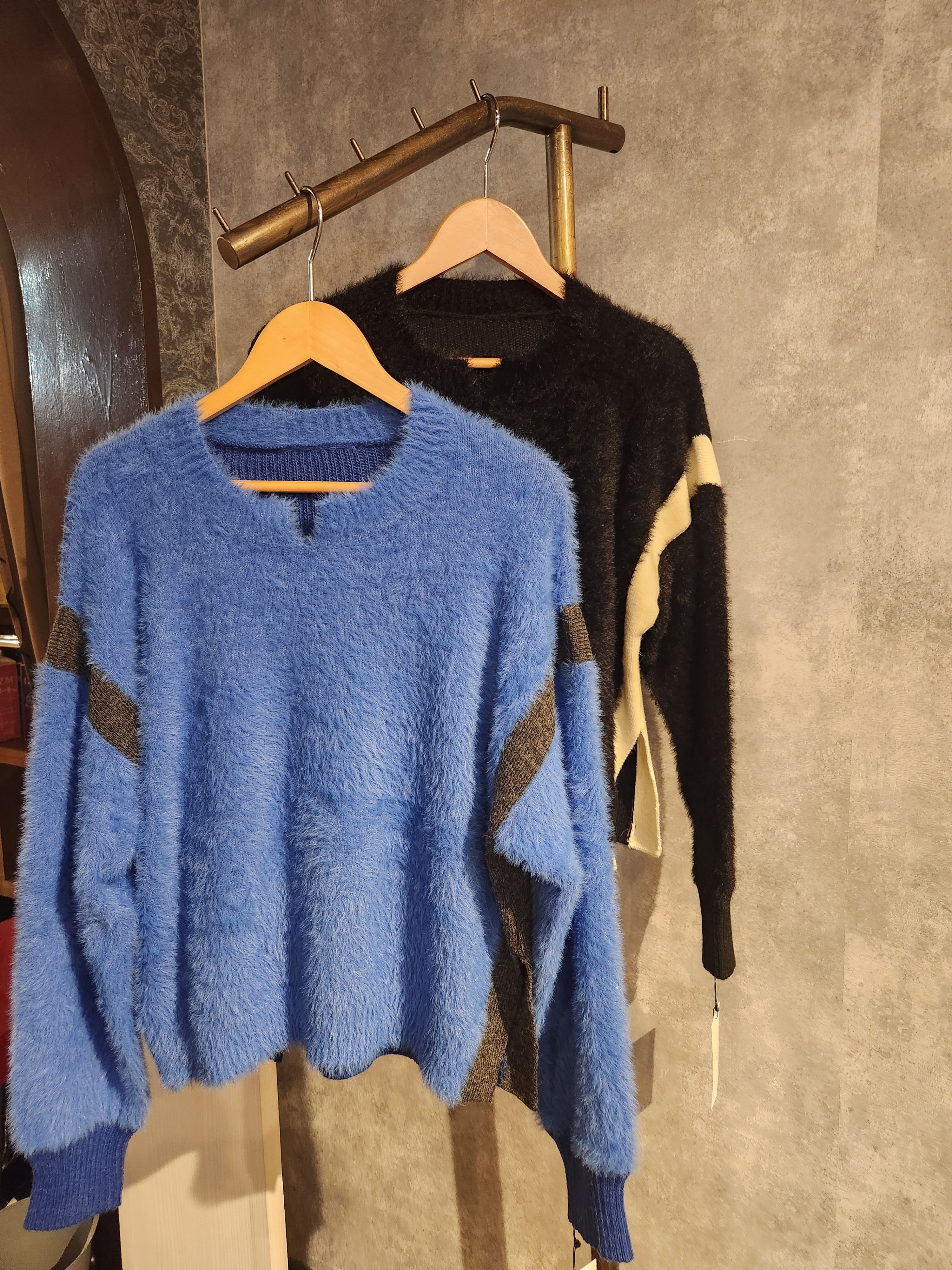 ライン使いとサイドスリットと胸元のVカットが華奢見せ効果抜群のシャギーニット。