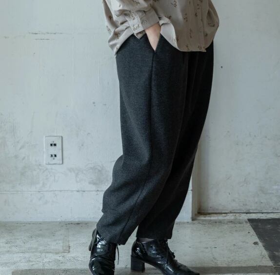 まるみのあるコクーンシルエットで程よく個性的なデザインのウールライクパンツ。