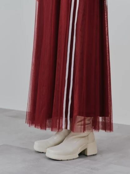 シンプルなチュールスカートにサイドラインをデザインした遊び心ある一着。裾に向かって広がるフレアシルエットが女性らしさを引き立て、動くたびに軽やかな揺れ感を生み出します。
