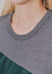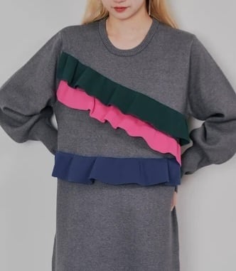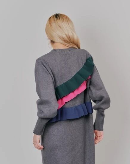 配色のフリルをティアードしたデザイン。大胆ながらもまとまりのある配色デザインで存在感のある主役級ワンピースニットです。