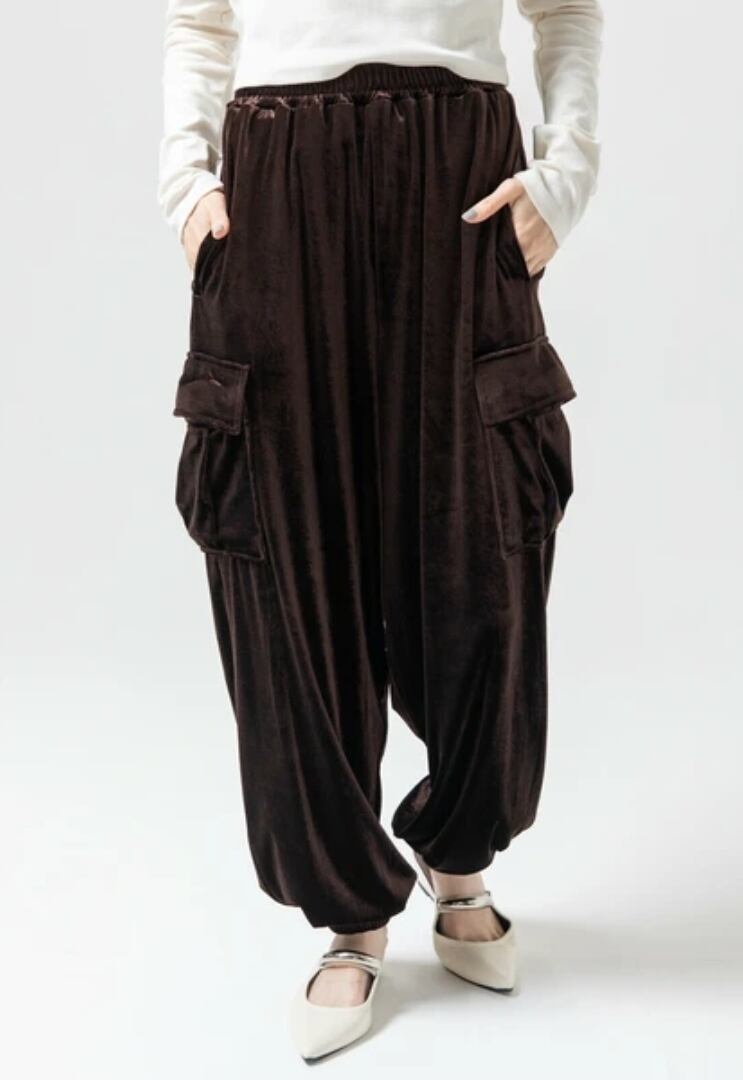トレンドのカーゴパンツと、リラックス感のあるジョガーシルエットを、シーズンムード高まるベロア素材で仕上げた、個性的なハイブリッドアイテムです。カジュアルながらも上品な光沢が大人な印象を与えます。