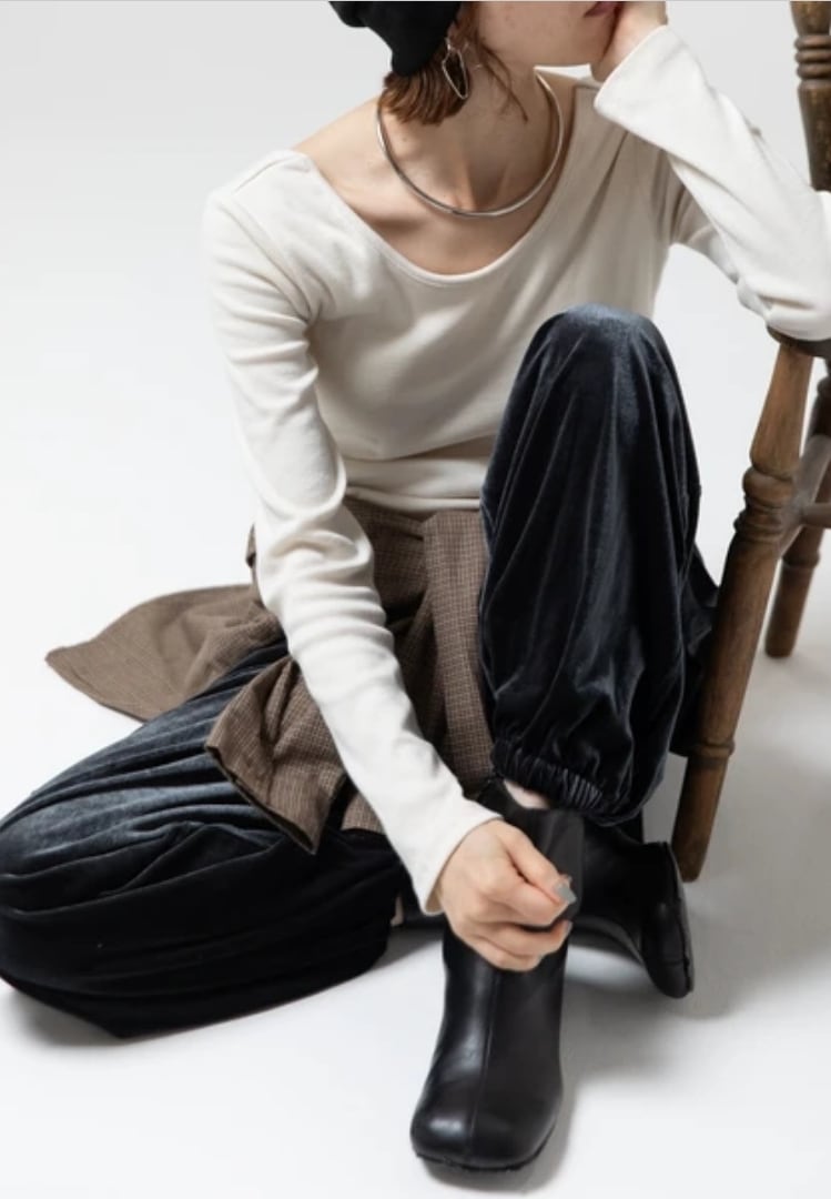 上品なベロア素材:カジュアルなデザインを、微光沢のあるベロアがエレガントに格上げ。肌触りが良く、秋冬らしい温かみのある素材感が魅力です。