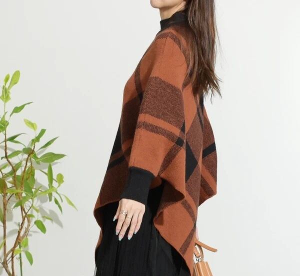 【ぶるち】1036 ダークオレンジチェックニットポンチョ