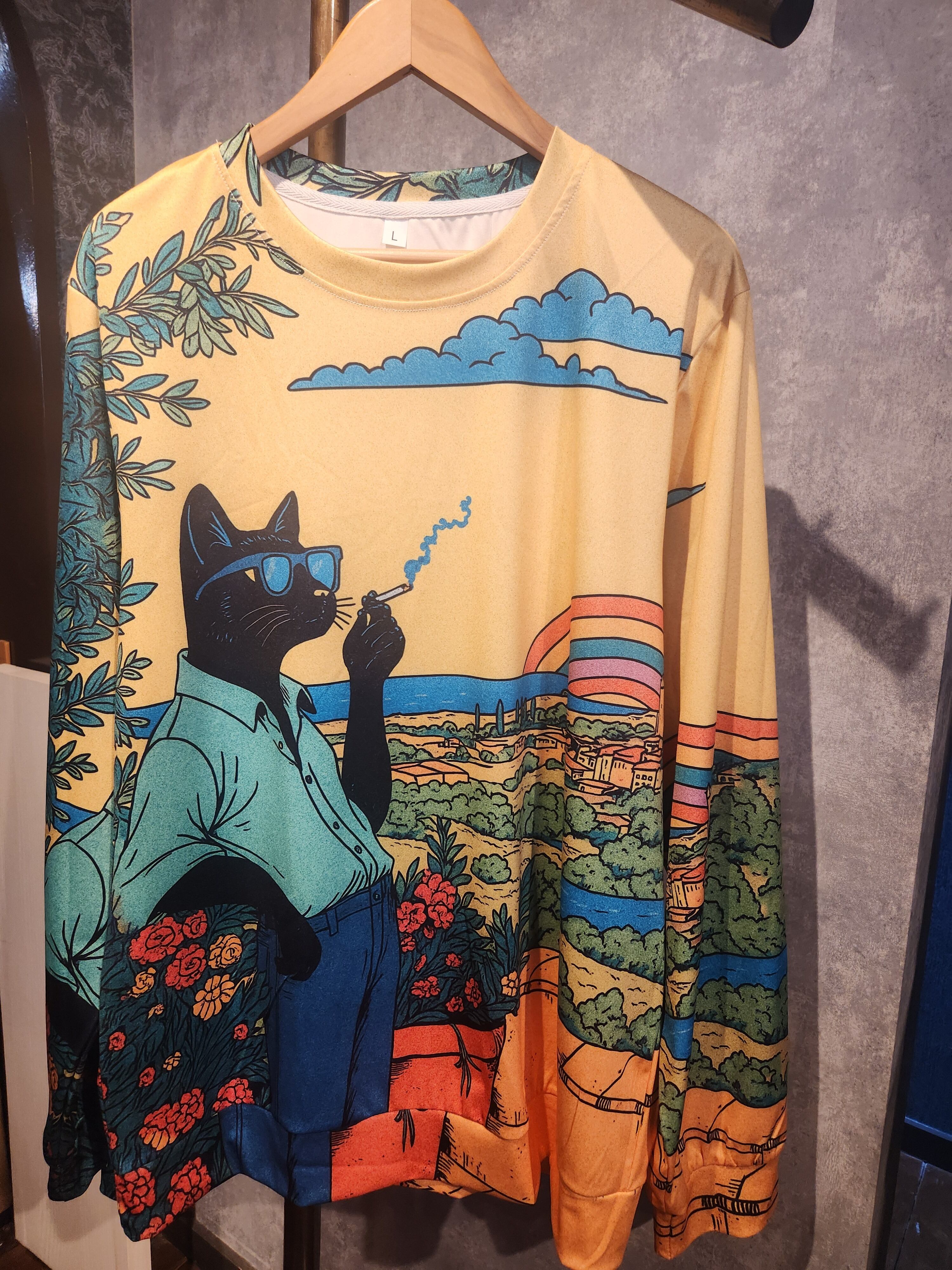 スモーキング休憩中のネコと虹と花の薄手スウェット。