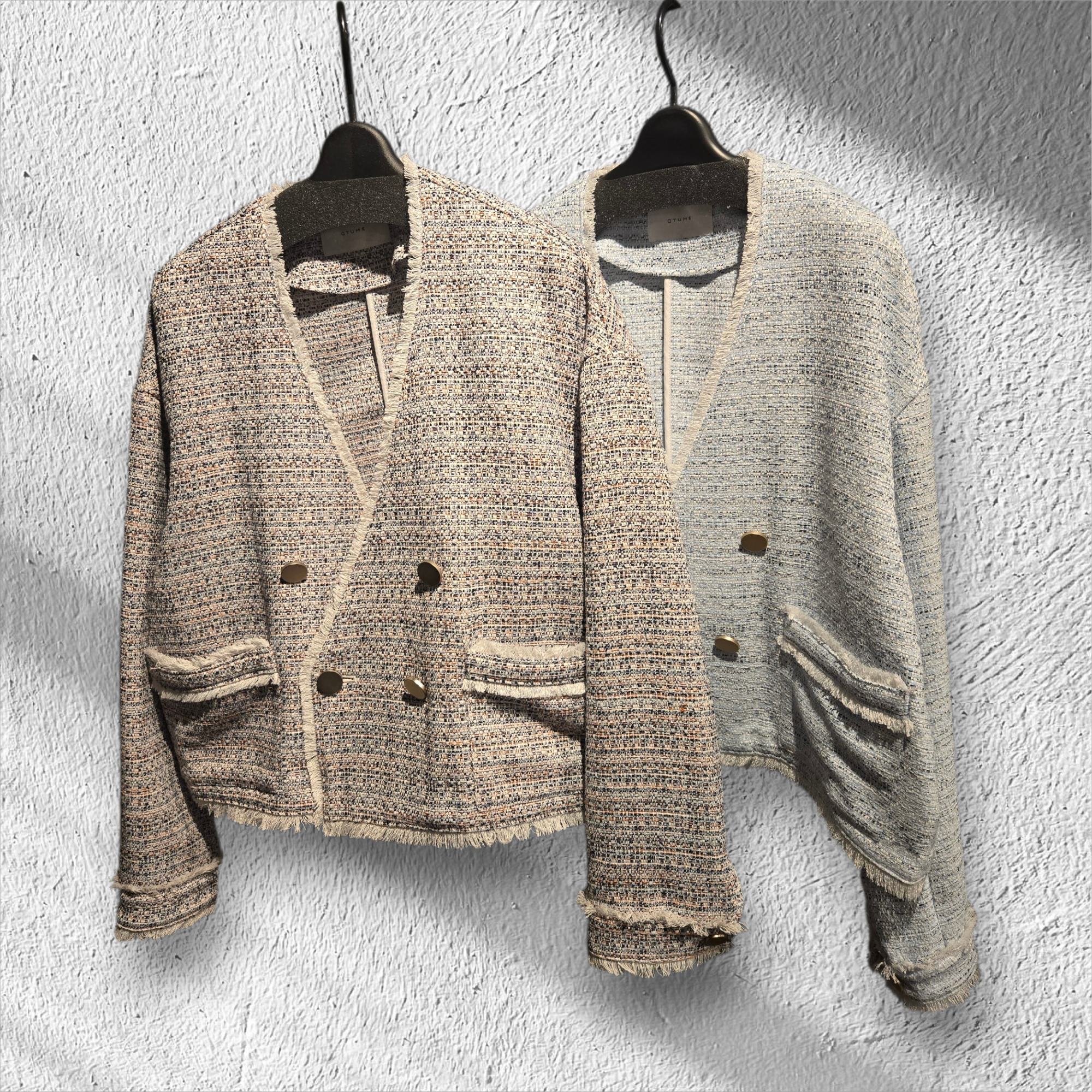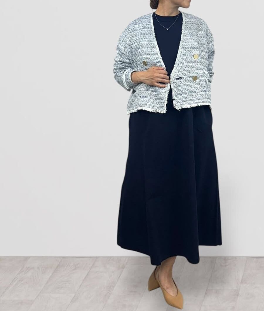 春の季節に丁度良い色合いのミックスツィードショートダブルジャケット。