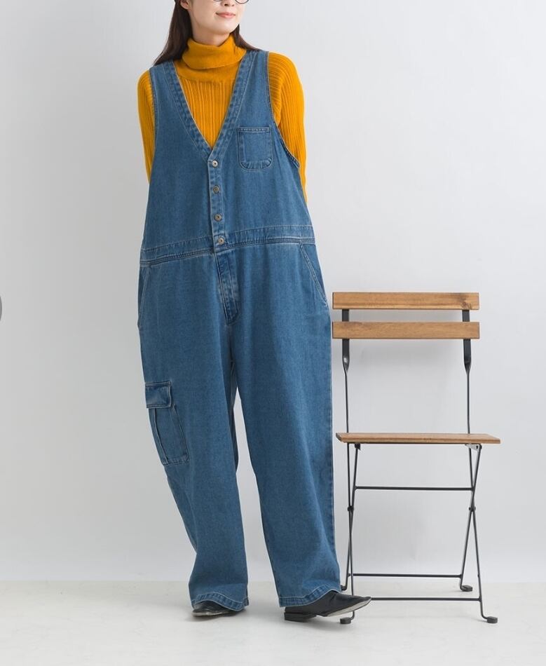 ワークディテールを取り入れたデニムサロペットは、ゆったりとしたワイドシルエット