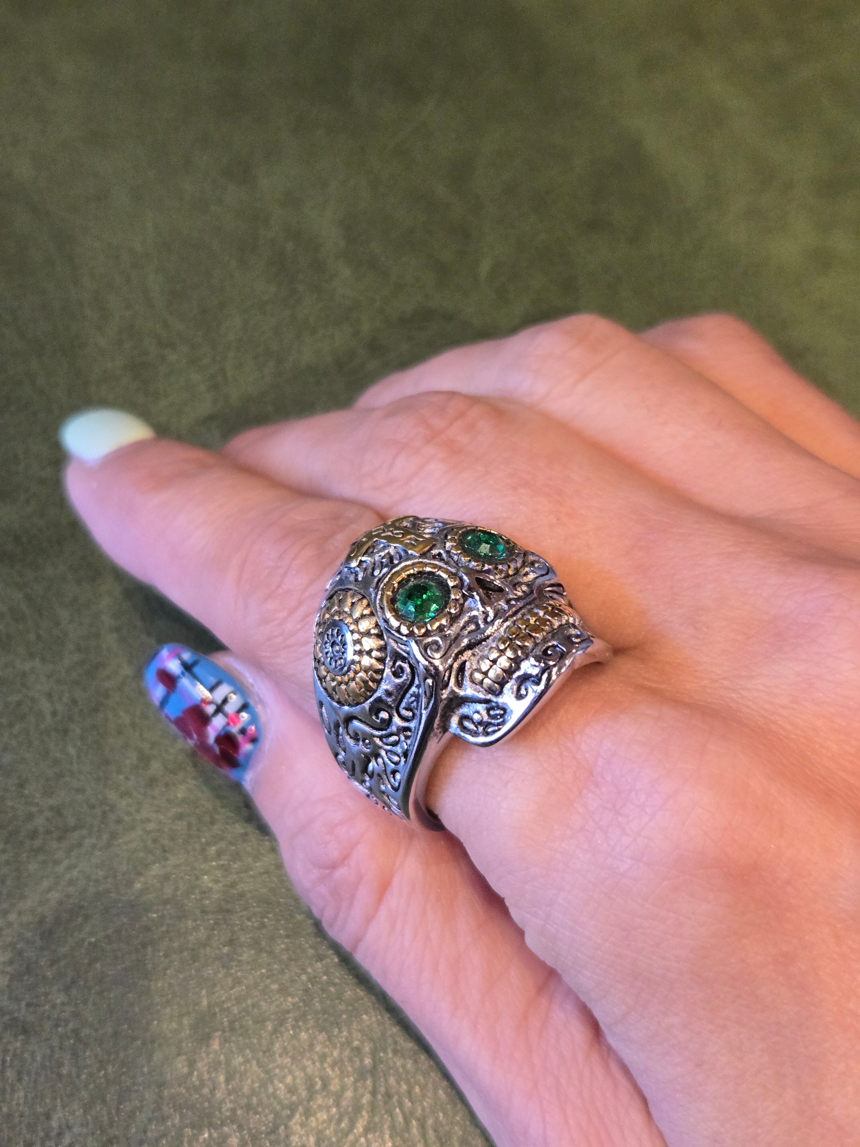シルバーのグリーンアイが光るスカルリング。
